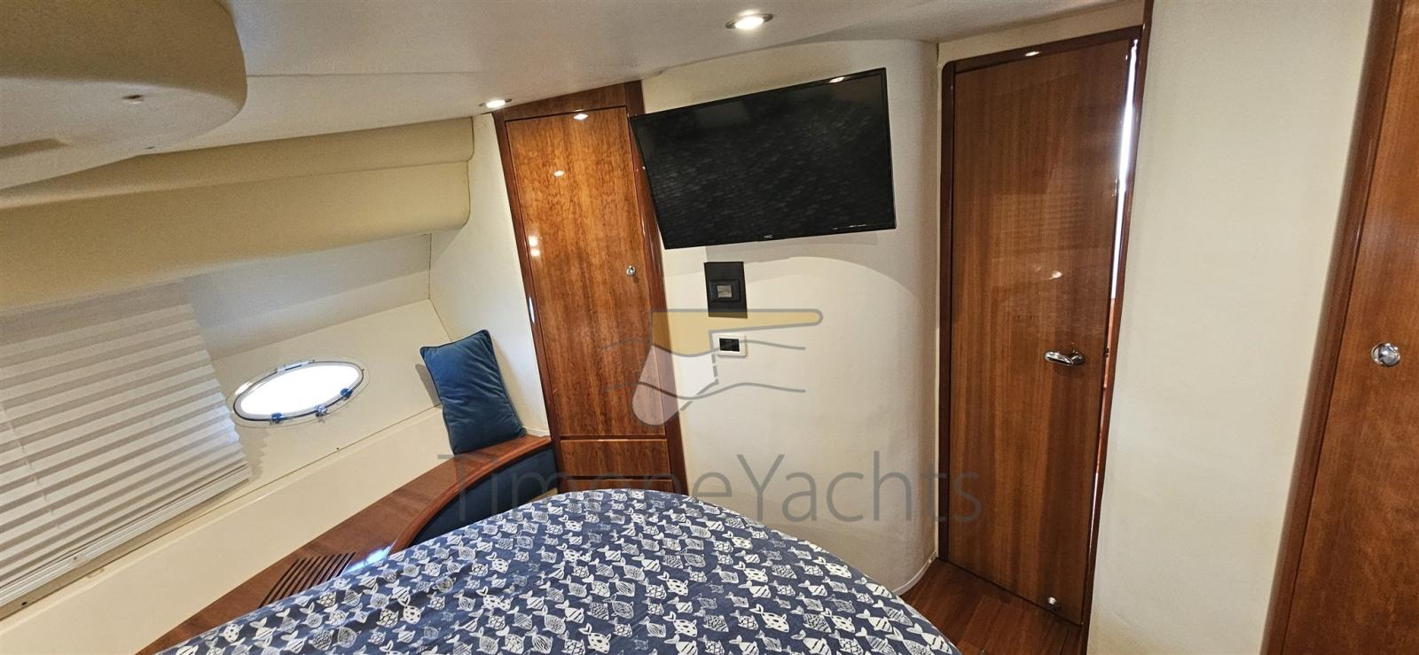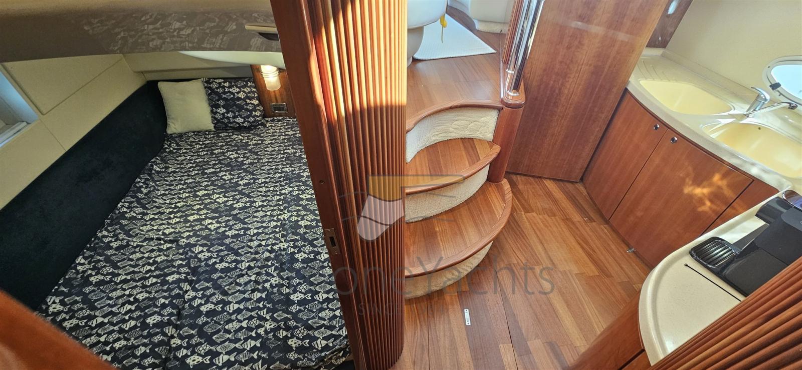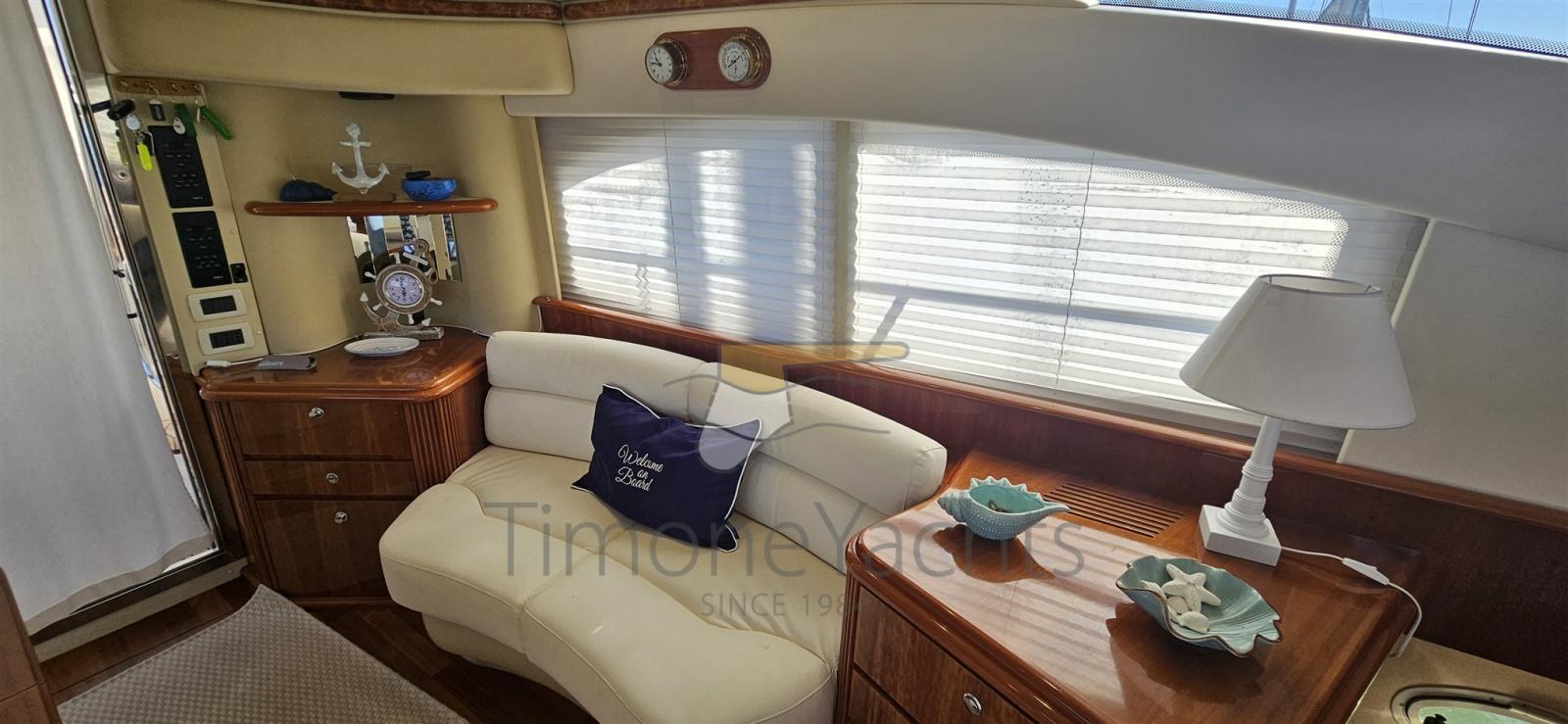 Gli spazi esterni sono ampi e ben sfruttabili, con flybridge attrezzato e zone prendisole che garantiscono una piacevole vita all’aperto. Gli interni risultano luminosi e accoglienti, con finiture di buon livello e una disposizione che assicura comfort e privacy agli ospiti.