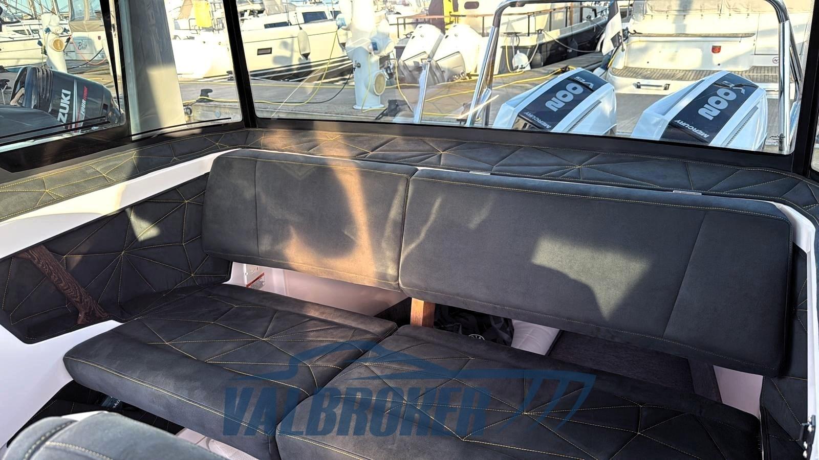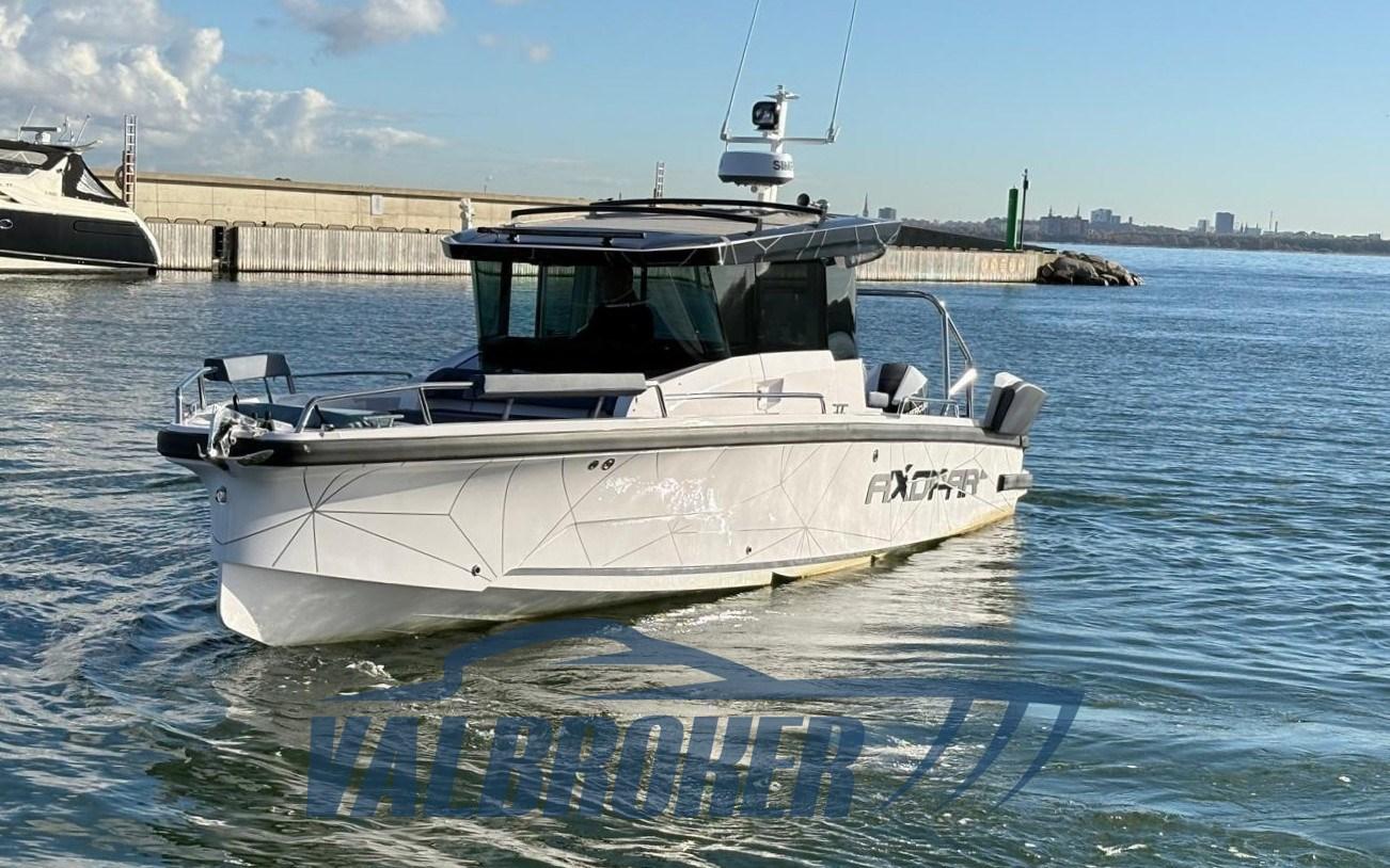 Borsa di sicurezza Axopar, doppie eliche Enertia da 19", pacchetto divano a U anteriore, Sphere, rivestimenti personalizzati della timoneria – Alcantara antracite (tema ragnatela), cuscini per parabordi, Sphere, Portapacchi, neri, Luci di coperta, Flap di assetto, Coprifinestre protettivi AX29, Cabina di poppa, Prendisole per cabina di poppa / vano portaoggetti multiuso, Rivestimenti interni per cabina di poppa, Cuscini per divano a L di prua, Tavolo di prua - divano a U, Divano a U di prua, Rivestimento dello scafo e del tetto della timoneria con tema ragnatela, Softdeck in giallo bruciato, tema ragnatela