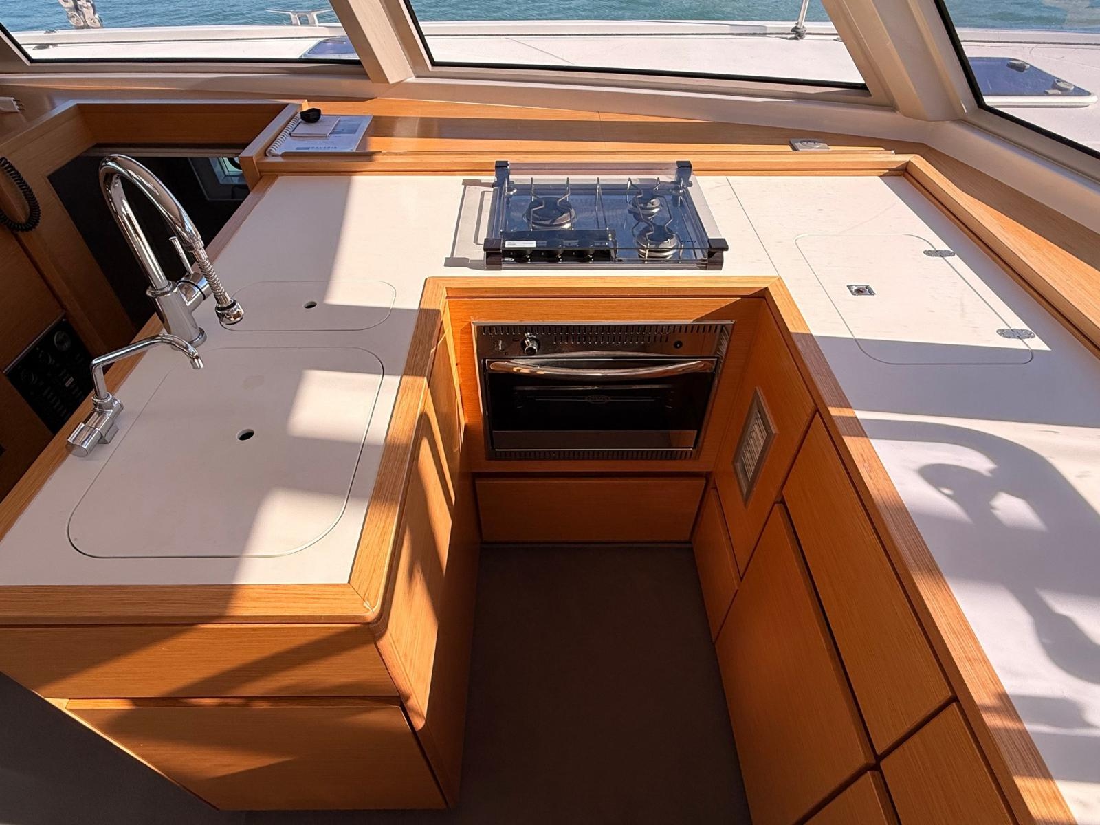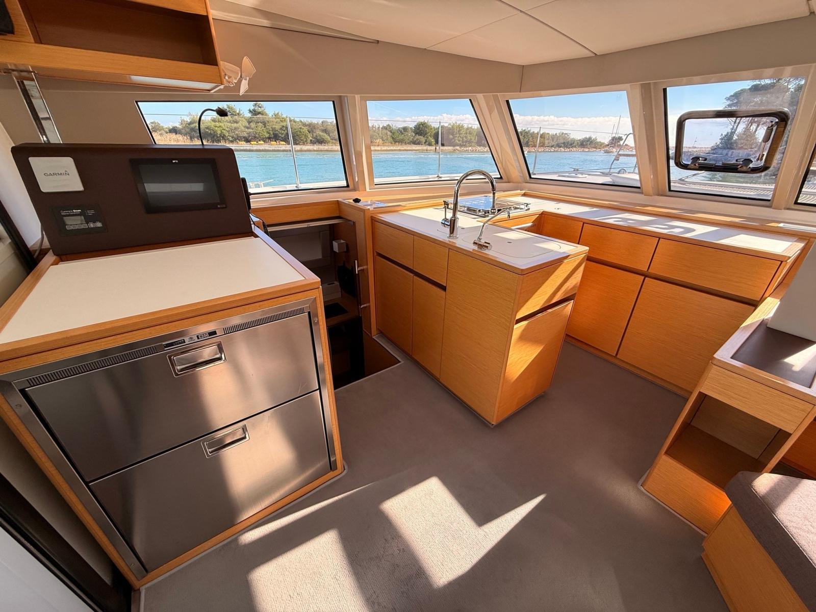 Il layout “Open” firmato Nautitech unisce in un unico ambiente ,diviso dalla porta scorrevole, pozzetto, dinette e cucina, creando un grande spazio conviviale luminoso e protetto. Interni curati nei dettagli, firmati Roseo Design, con materiali di qualità e ampie finestrature panoramiche.