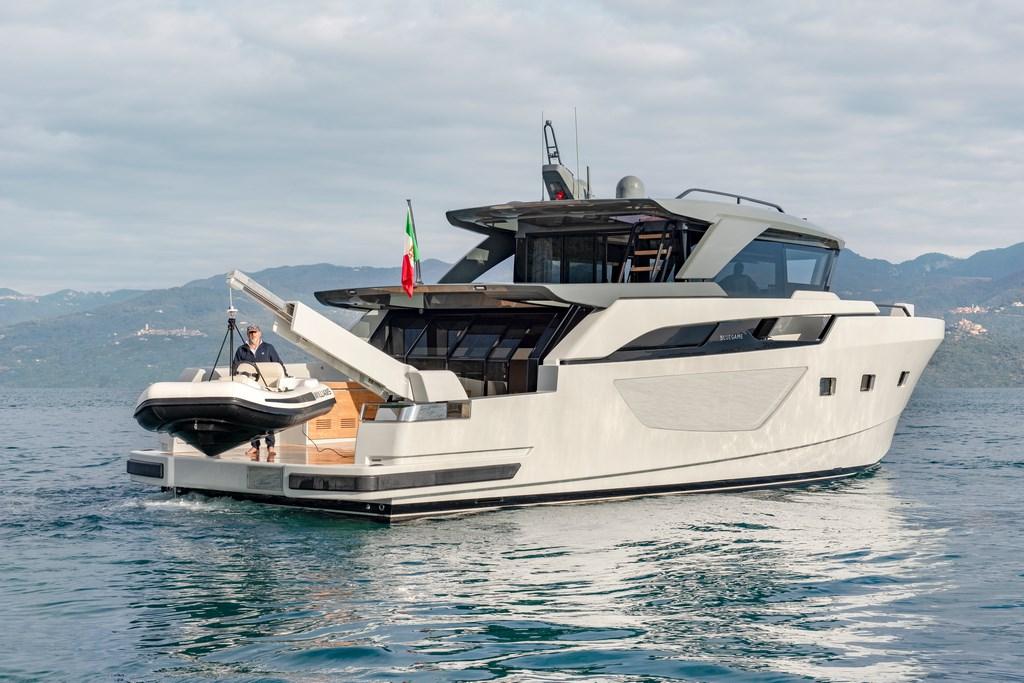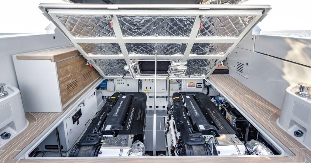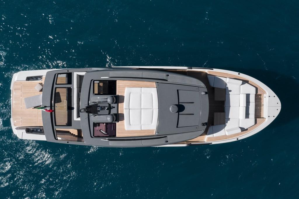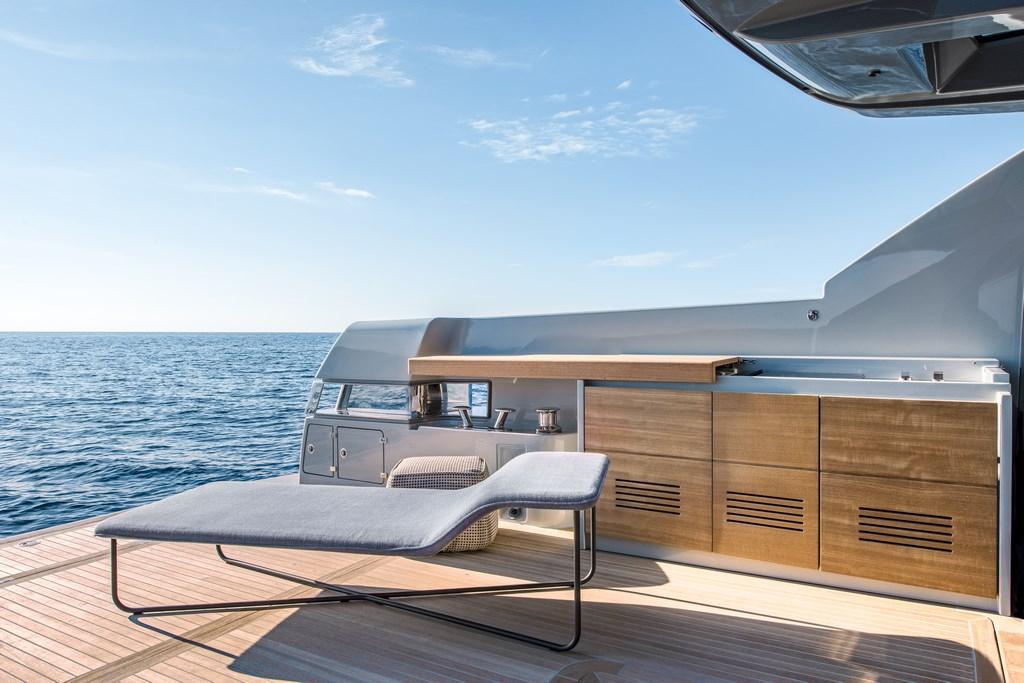 Allarme motore, Allarme sentina, Apertura Vano Motore Elettrica, Auto Dynamic Trim Interceptor, Autoclave, Auto-Trim, 2 Bitte Abbattibili, Bocche di Lupa, Camminamenti laterali in teak, Doccia esterna, Fari fissi a poppa, Faro orientabile, Gruette, Hard top, Impianto antincendio, Lavaggio catena, Lavandino nel Pozzetto, Luci di cortesia, Luci subacquee, Passerella (Pantograph), Piattaforma, 3 Porta ingresso, Porta laterale, Pozzetto Teak, Presa 220V banchina, Salpa Ancore Elettrico, Scaletta da bagno (Pantograph), Stabilizzatori (gyro), Tavolo pozzetto (Private terrace in upper deck), Tromba, 2 Winch tonneggio di poppa, Winch tonneggio di prua.