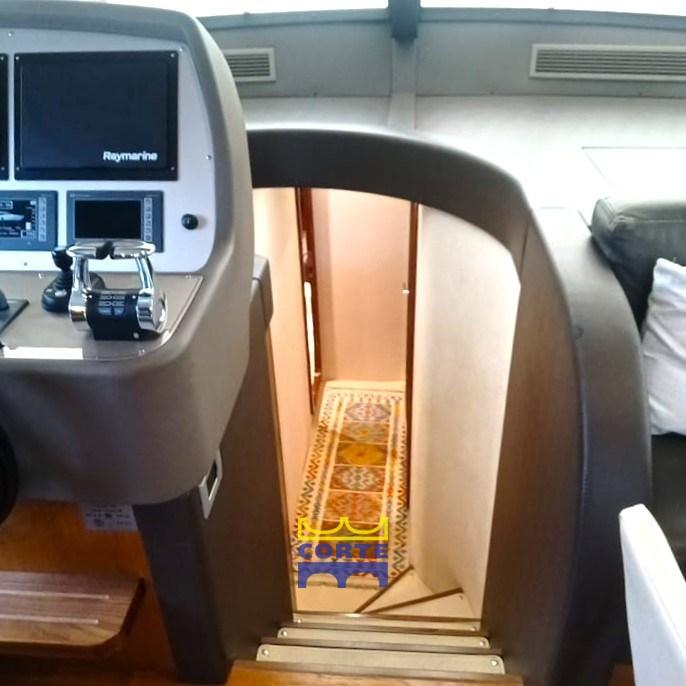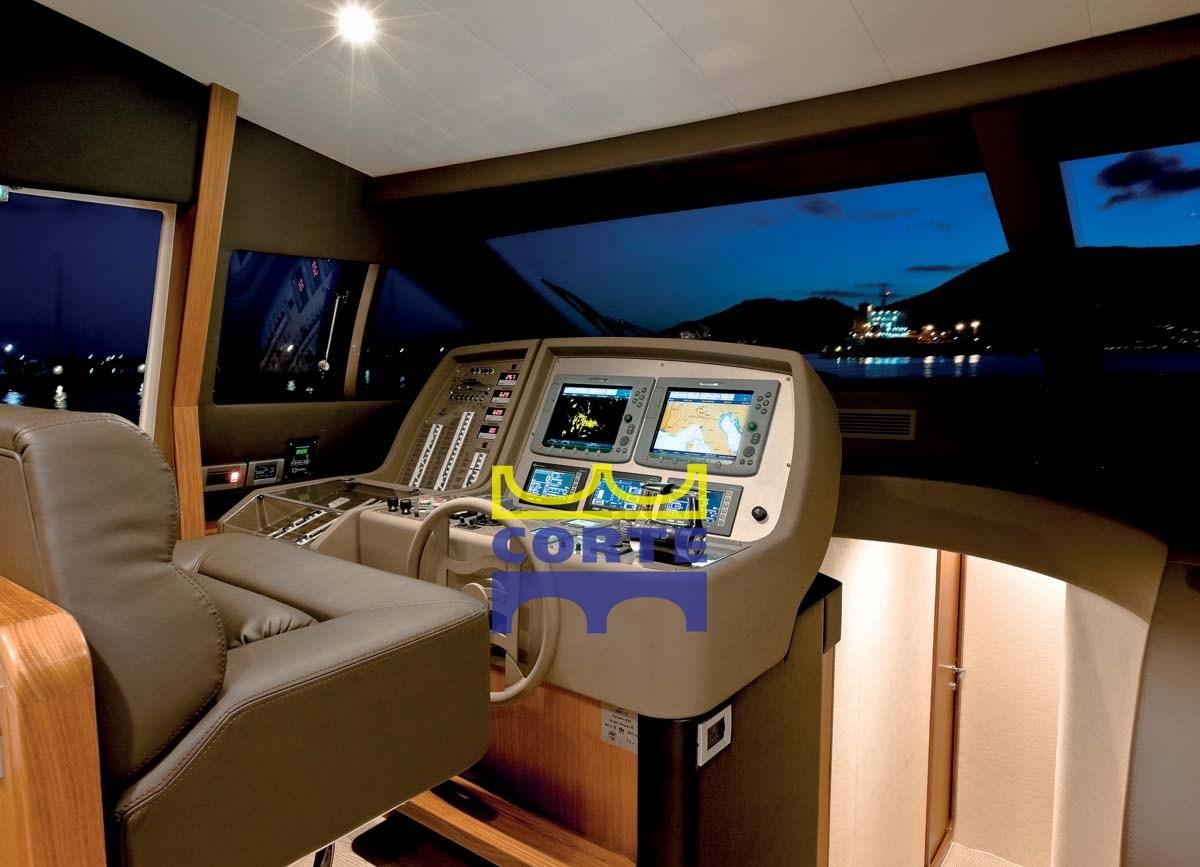 Antenna radar (Radome), Comando motori elettronico, Contametri catena, Display (MAN), Pilota automatico (Raymarine ST 7002), Plotter con antenna GPS (Raymarine display E120), Radar (Raymarine), Radio VHF (Raymarine).