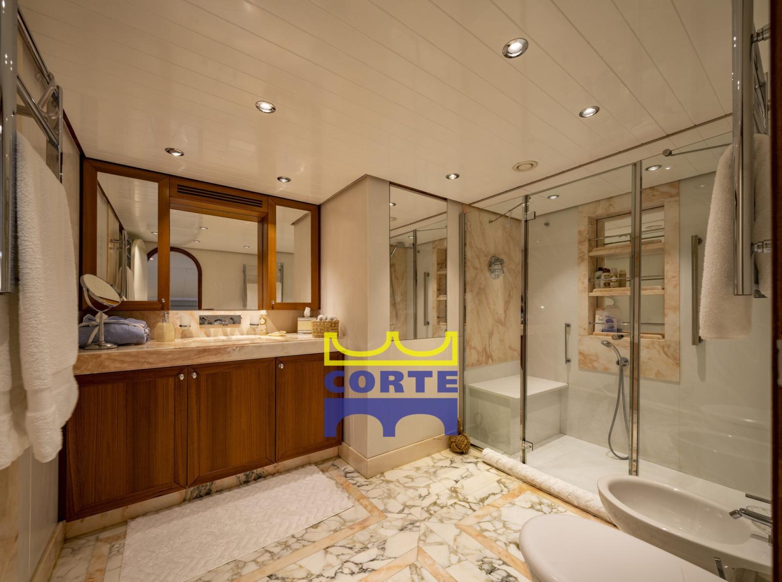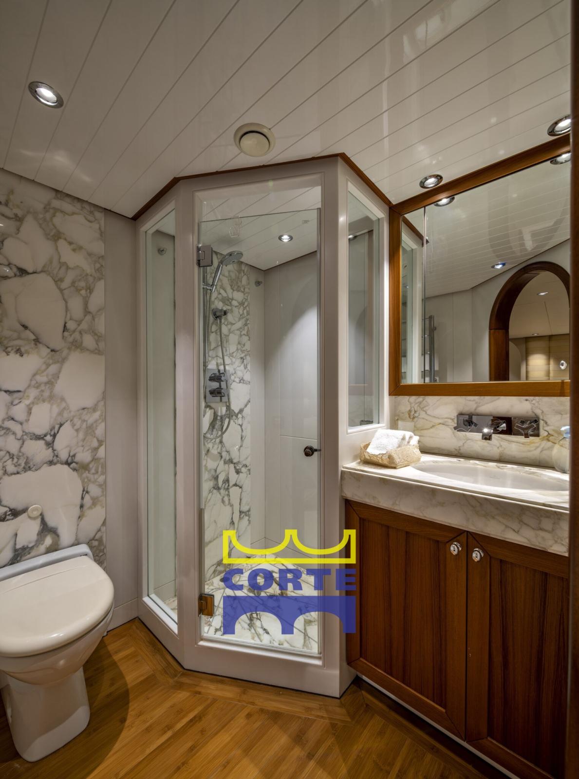 Bagno di servizio, con lavabo in marmo Blue Bahia, è situato centralmente sul ponte principale, nella lobby tra la suite dell'armatore e il salone principale e adiacente alla scala circolare che accede agli alloggi degli ospiti e alla timoneria.