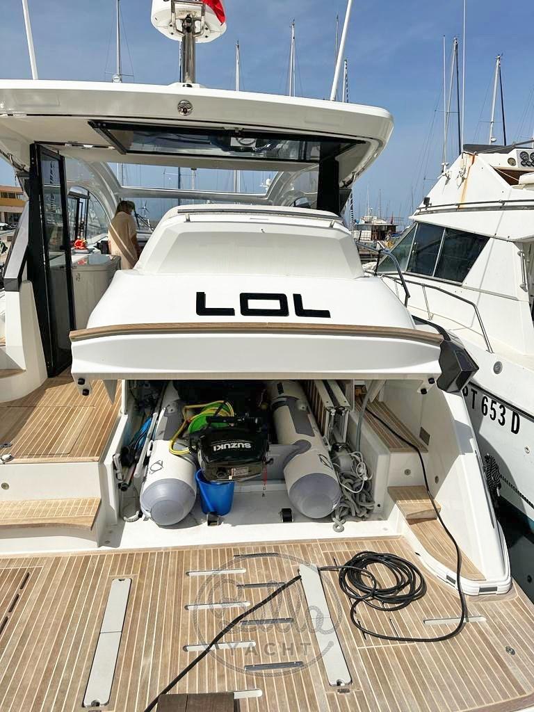 Allarme motore, Autoclave, Colorazione speciale, Doccia esterna, Flap elettrici (LENCO), Garage per tender, Hard top, Impianto antincendio, Luci subacquee, Motore ausiliario (6 CV), Passerella, Piattaforma, Pozzetto Teak, Presa 220V banchina, Presa acqua banchina, Salpa Ancore Elettrico, Scaletta da bagno, Tavolo pozzetto, Tender (Gonflable).