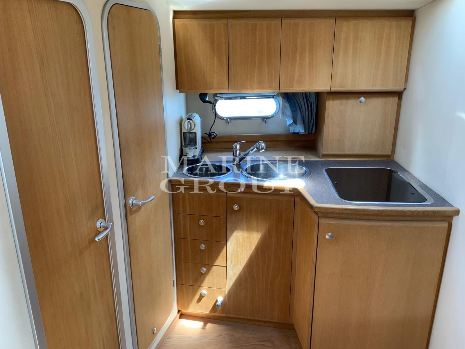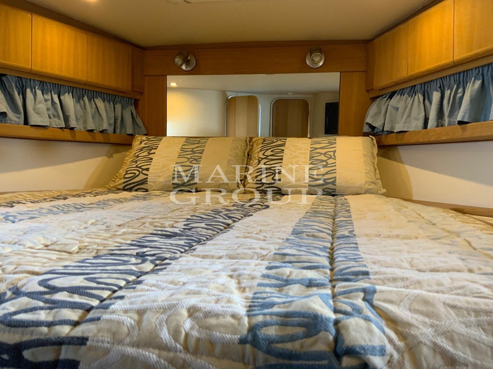 Dinette con divano in pelle trasformabile in letto matrimoniale; cucina interna con 2 lavelli e 3 fuochi, frigorifero, vari stipiti; cabina armatore a prua con letto matrimoniale e bagno privato ensuite con box doccia; cabina ospiti con letto matrimoniale; terza cabina ospiti doppia con letti singoli in piano; secondo bagno ospiti con doccia.