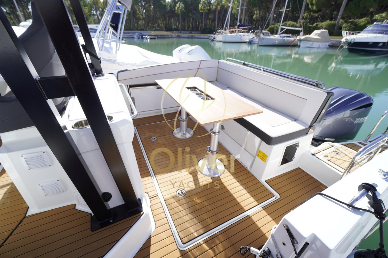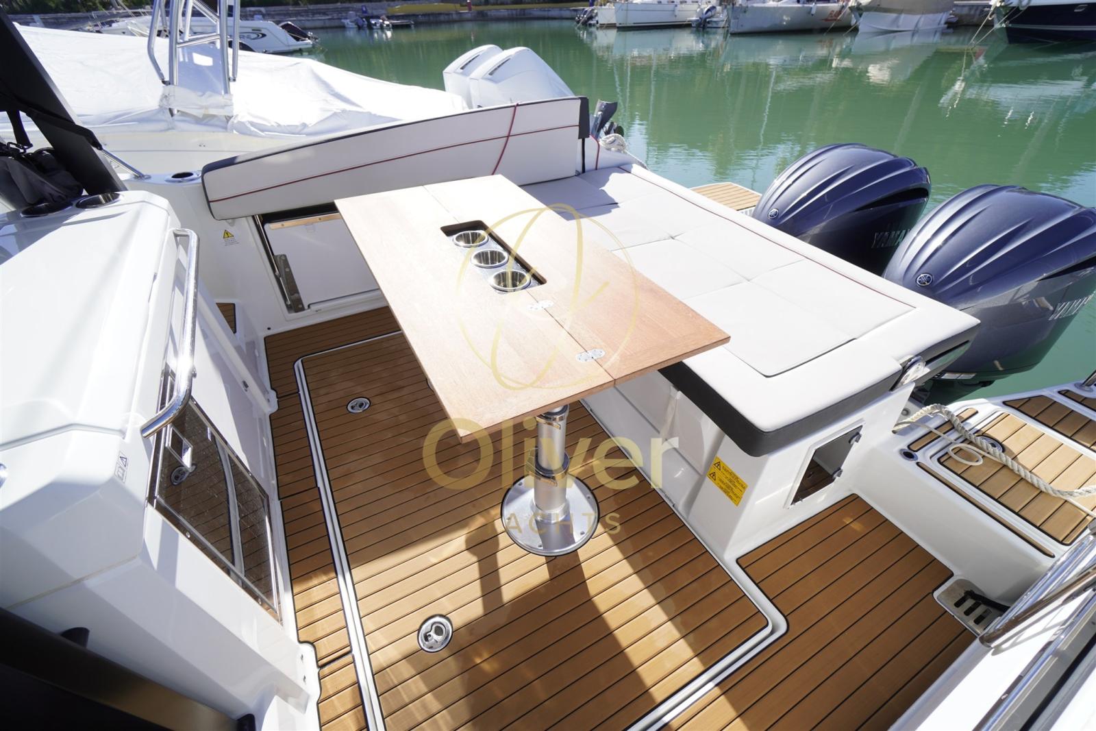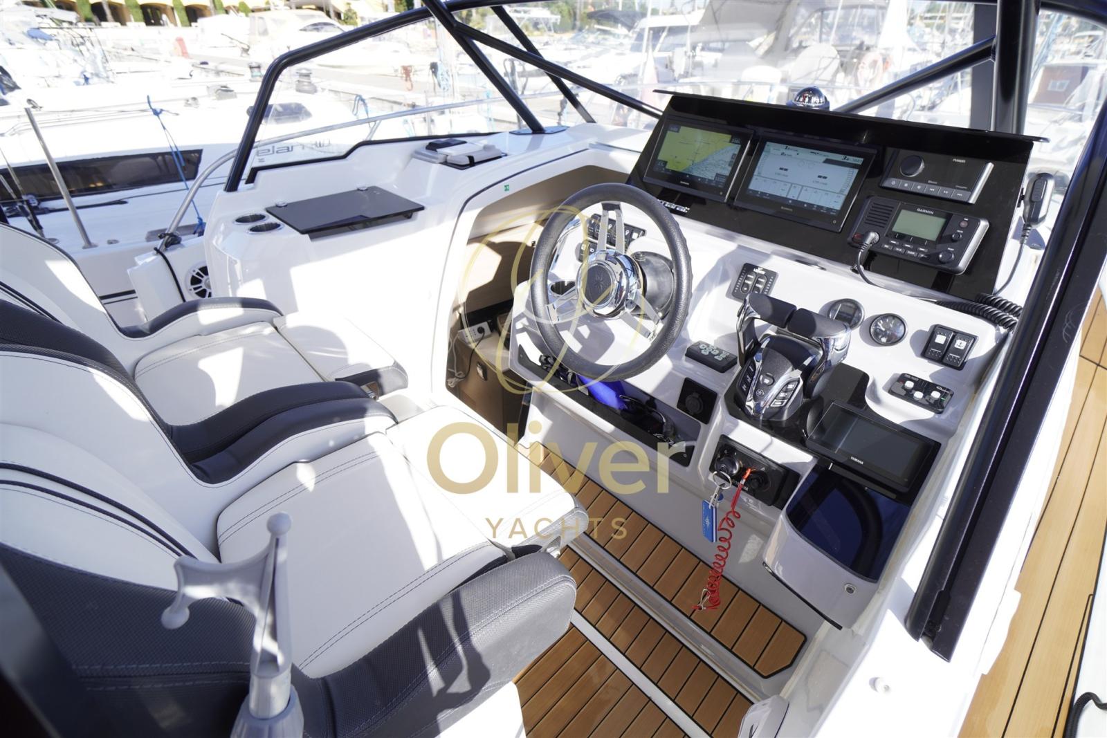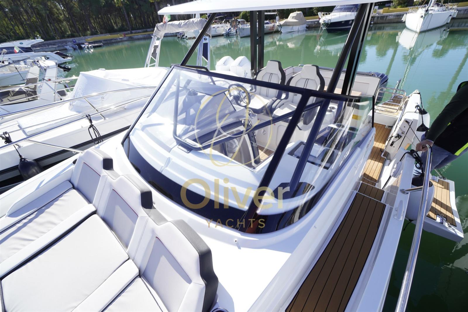 La barca è equipaggiata con una dotazione elettronica di livello superiore: doppio monitor Garmin da 9”, contacatena elettronico, faro orientabile elettronico e flaps idraulici, elementi che migliorano sia la sicurezza sia la precisione in navigazione. La presenza dell’elica di prua facilita ogni manovra in porto, mentre il tettuccio apribile e il tendalino di poppa retraibile con laterali parasole garantiscono massimo comfort nelle giornate più calde. A prua è presente il tendalino con pali in carbonio, perfetto per creare un’area ombreggiata dedicata al relax.