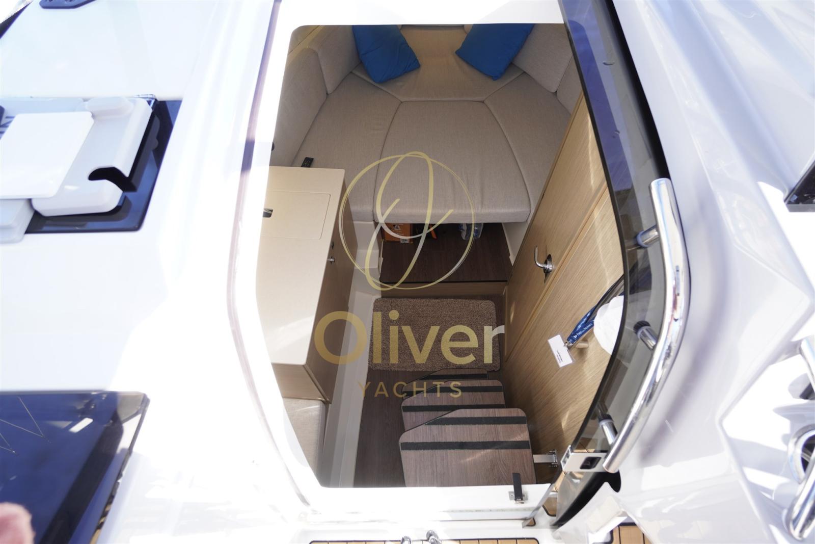 La coperta è altrettanto ben organizzata: area prendisole di prua con tenda araba, layout walk-around che facilita ogni movimento, tettuccio apribile per una migliore aerazione e apertura laterale del pozzetto che aumenta l’accesso al mare e la fruibilità delle aree esterne.