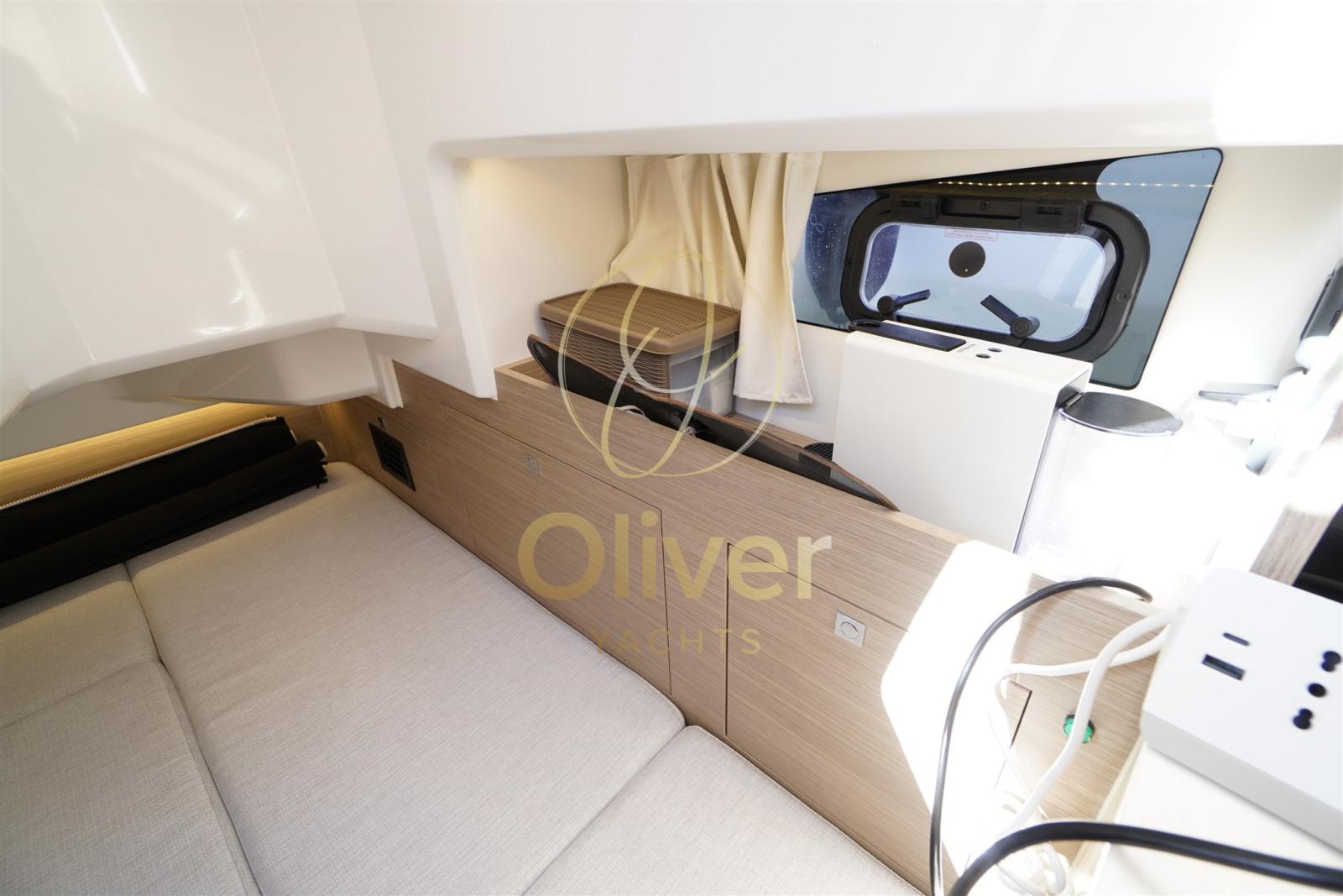 La dinette si trasforma rapidamente in un letto ampio, ideale per due persone, rendendo la cabina perfetta per brevi crociere. Le ampie finestrature laterali portano luce naturale all’interno, creando un’atmosfera ariosa e piacevole. L’angolo cottura attrezzato con frigorifero dedicato permette di gestire facilmente colazioni e snack, mentre il bagno separato completo assicura la praticità necessaria per trascorrere più giorni in barca senza rinunce.