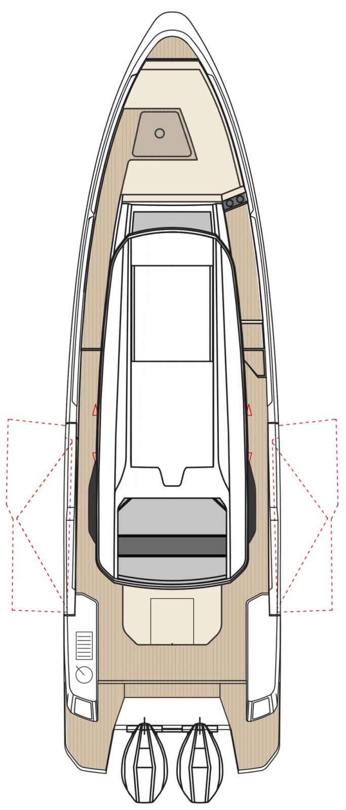 2 Allarme motore, Allarme sentina, Alternatore, Flap elettrici, Hard top, Lavandino nel Pozzetto, Luci di cortesia, Piattaforma, 3 Pompa di sentina automatica, Porta ingresso, Porta laterale, Scaletta da bagno, Tavolo pozzetto, Tromba.