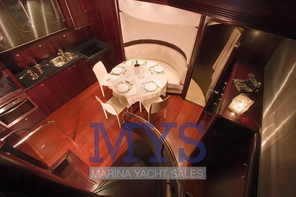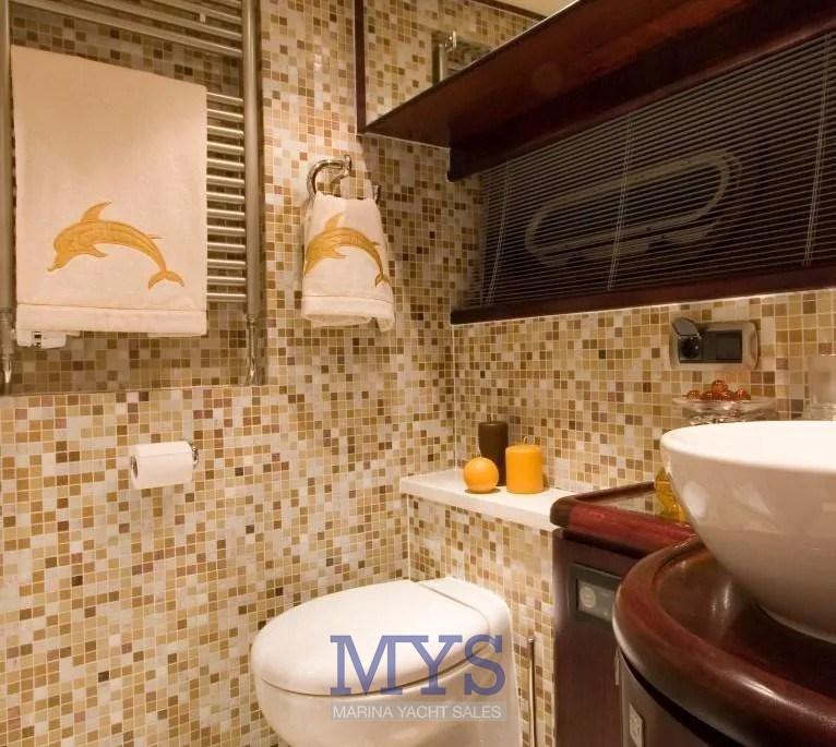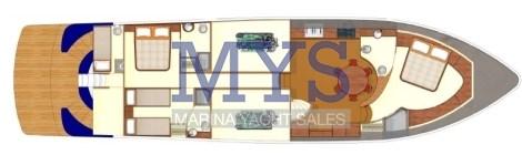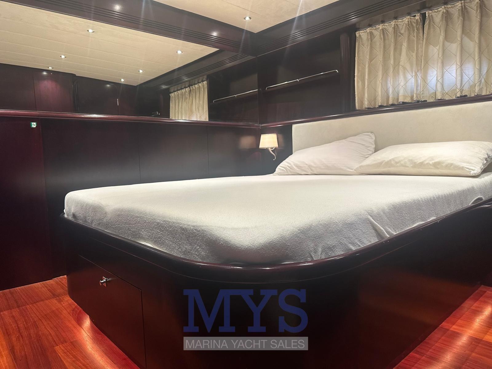 Cabina Armatoriale scendendo gli scalini a proravia con bagno con bidet e cabina doccia separata , cabina vip ospiti con letto matrimoniale a poppa , cabina con 2 letti in piano separati più 1 letto pulman , 3 bagni , Alloggio equipaggio con accesso separato dalla plancetta di poppa con servizi .