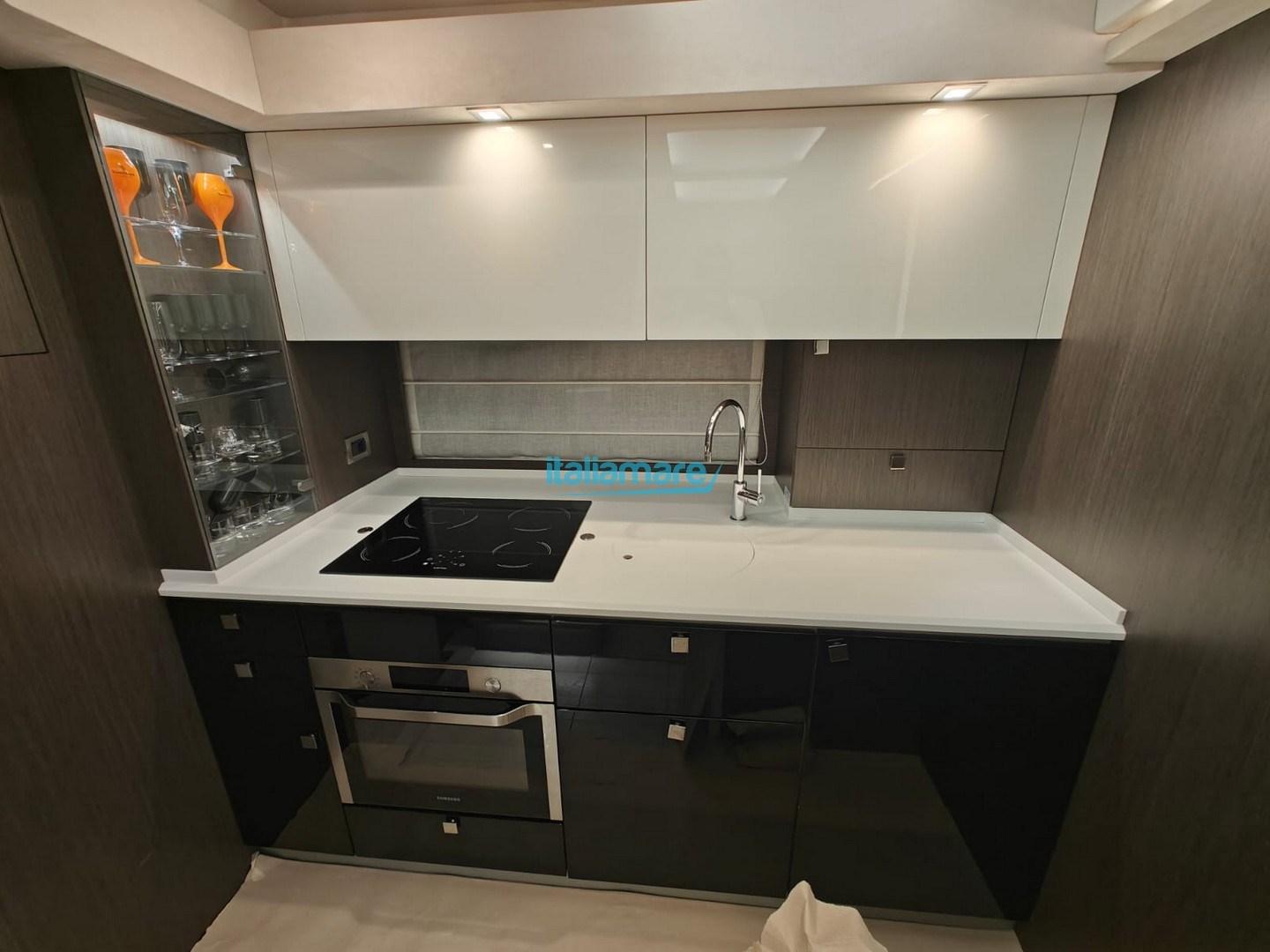 The lower saloon is an airy and well-lit environment, thanks to the wide companionway, which houses a dinette/dining area and a well-equipped and spacious galley.