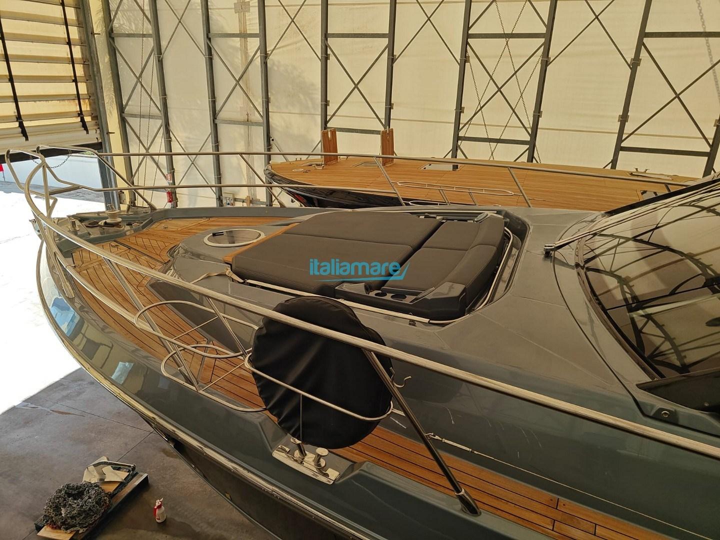 Due grandi aree prendisole molto confortevoli: una a poppa sopra il garage e una spaziosa a prua, facilmente accessibile grazie a passavanti larghi e una robusta battagliola.