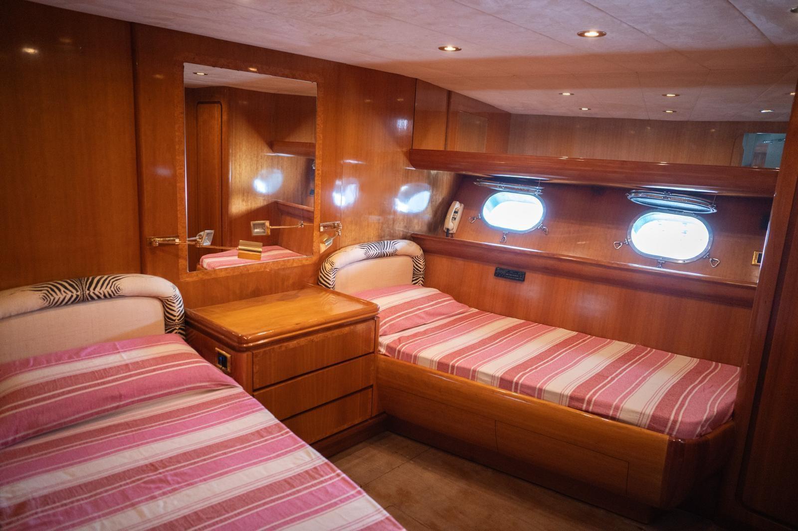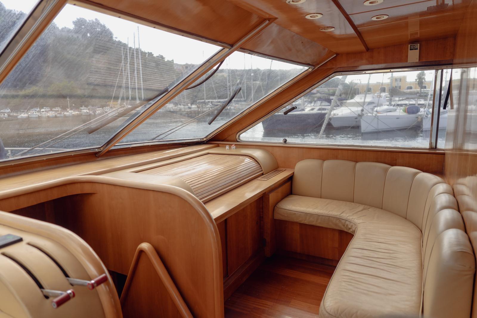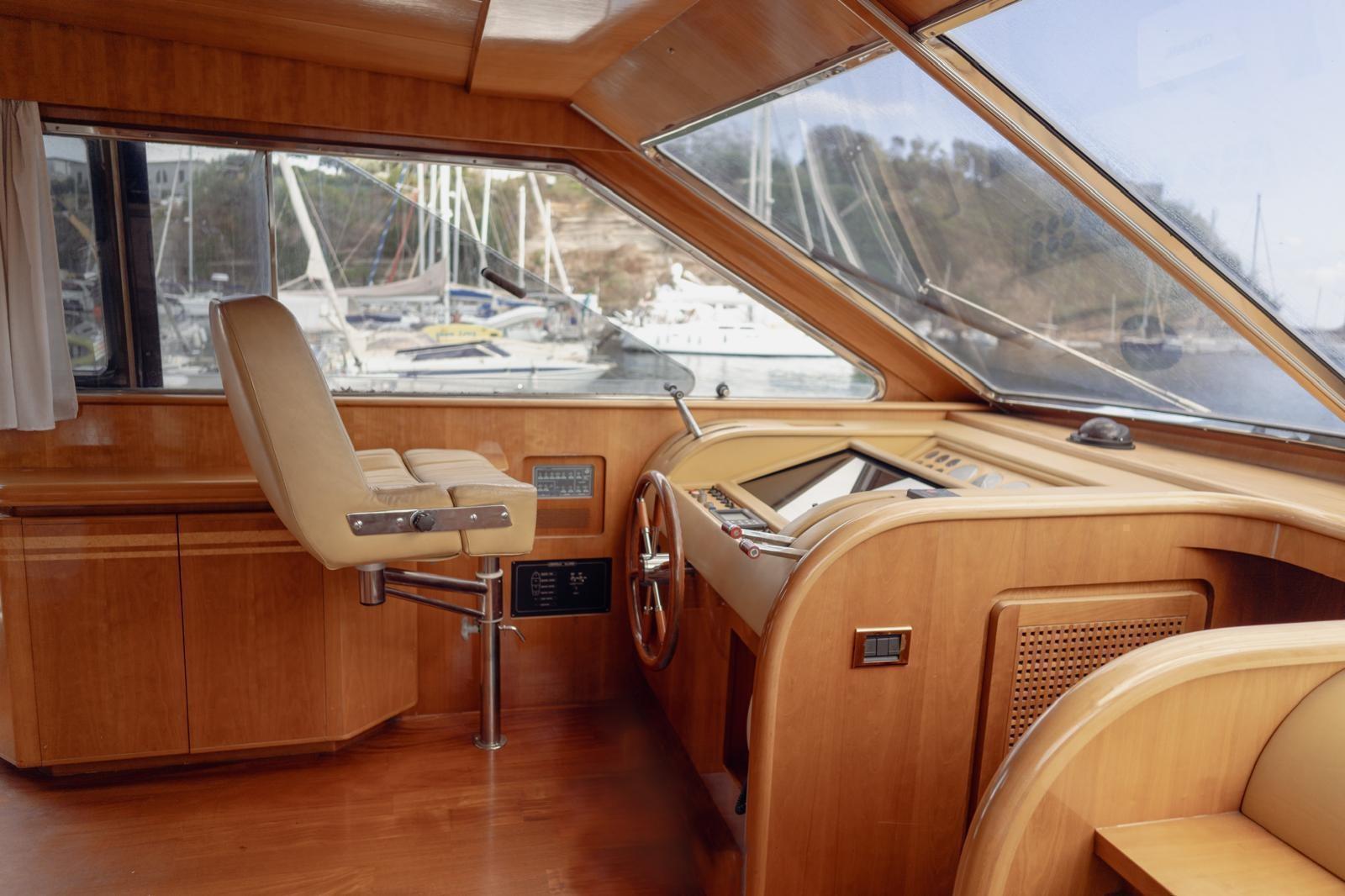 Antenna satelittare, Aria condizionata, Asciugatrice, Autoclave, Autopilota, Barometro, Batterie, Binocolo, Boiler, Bussola, Cuscineria completa, Dissalatore, Doccia esterna, Ecoscandaglio, Frigo e piastra elettrica su fly, GPS, Igrometro, Impianto antincendio fisso in vano motori, Indicatore angolo barra, Tv, Lavastoviglie, Lavatrice, Lettore dvd, Log, Pompe sentina (2 elettriche, 1 manuale), Passerella, Radar, Radio VHF, Salpancora, Stereo, Tavolo con sedute in pozzetto, Tendalino, Tender, Winch tonneggio di poppa