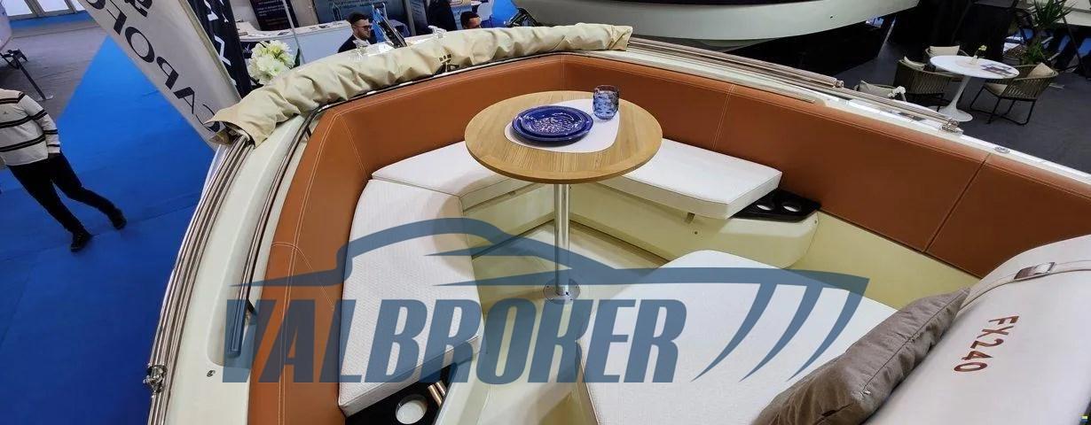 FX 240 offre ai suoi ospiti eleganza e versatilità, grazie alla zona di prua che può ospitare un comodo divano appoggiato alla murata, oppure rimanere libera per i pescatori più appassionati. Consolle e posto guida sono studiati nei minimi particolari per essere totalmente integrati e fruibili.