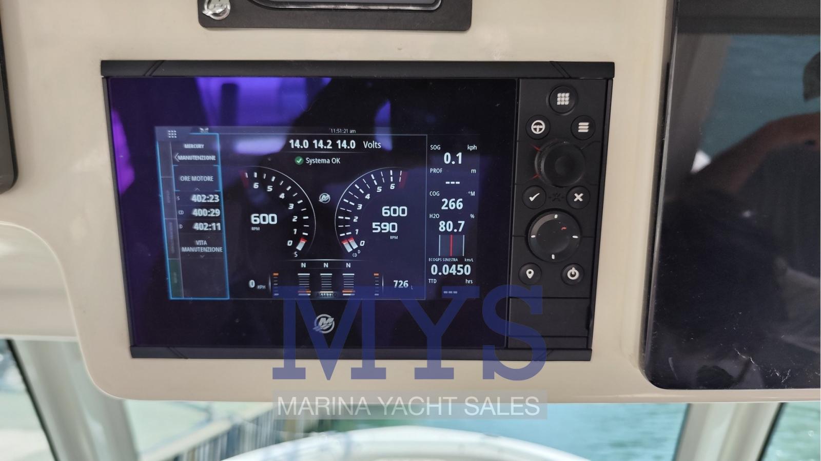 AIS, Angolo barra, Antenna radar, Comando motori elettronico, Computer di bordo, Ecoscandaglio (Raymarine), Joystick, Plotter con antenna GPS, Yacht controller.
