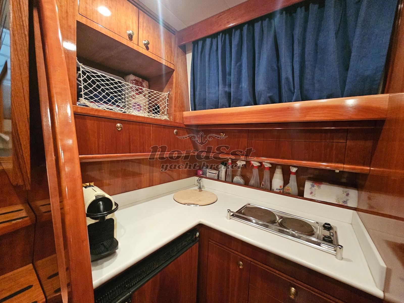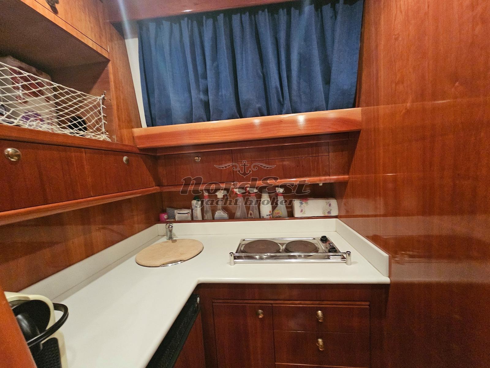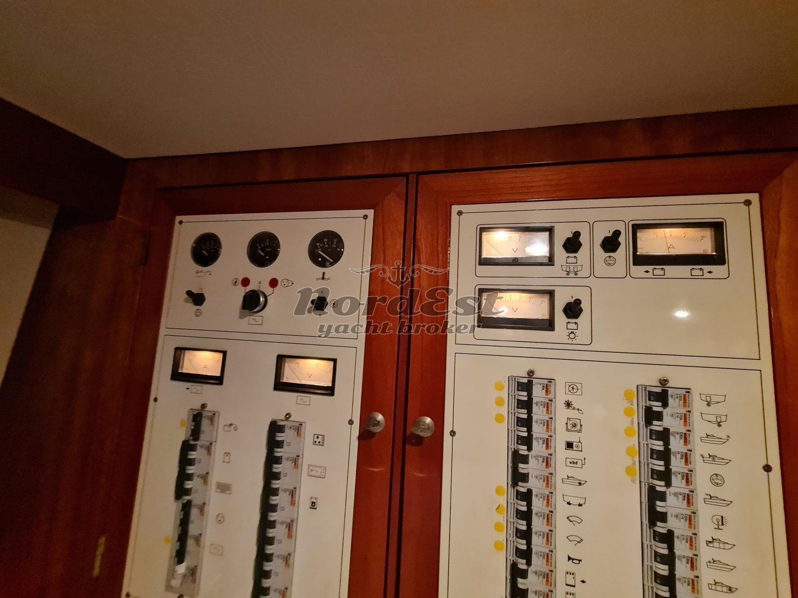 Generatore: Kohler 6.5 kw- Tensione di bordo: 12 / 220 V - Caricabatterie - Autoclave - Boiler - Impianto antincendio - Doccia esterna - Flaps - Passerella - Plancetta: in teak - Impianto acque nere - Frigorifero esterno - Mobile bar: si, in dinette : predisposizione - Frigorifero - Piano cottura: elettrico no induzione - Bimini top: prua e poppa - Cuscineria prendisole