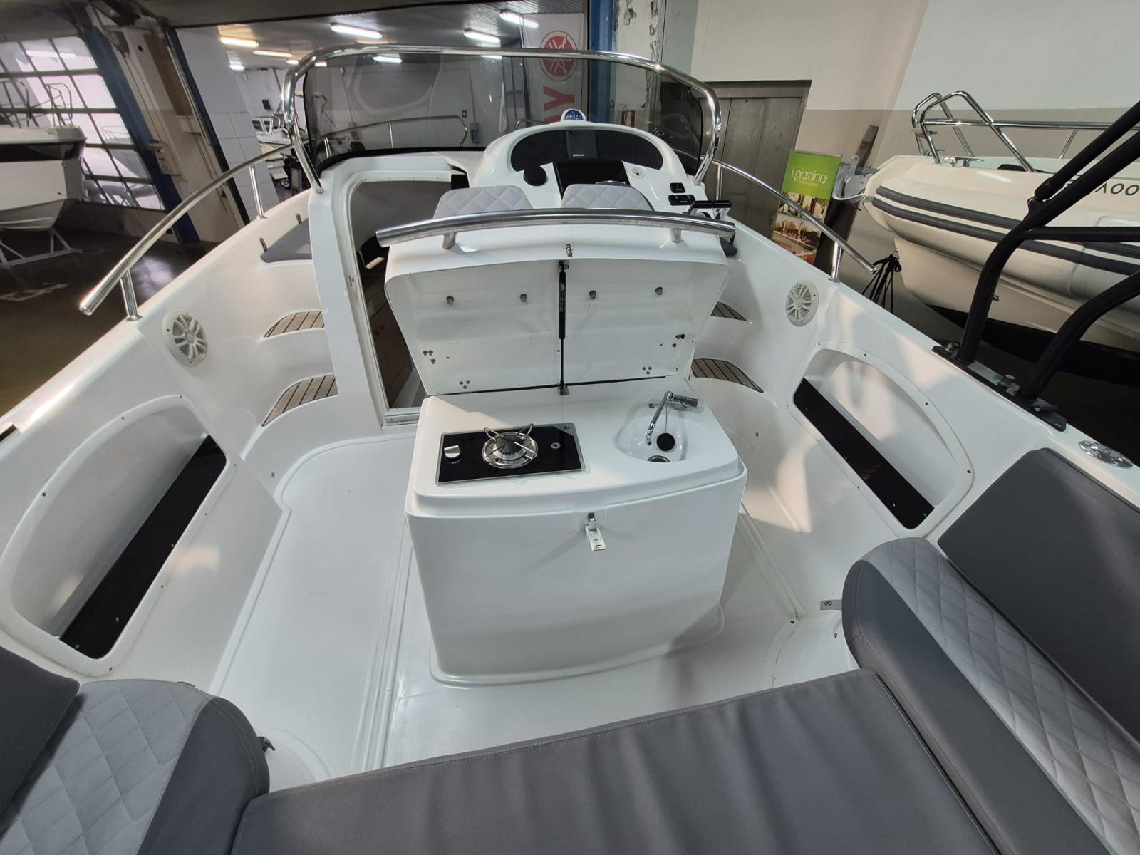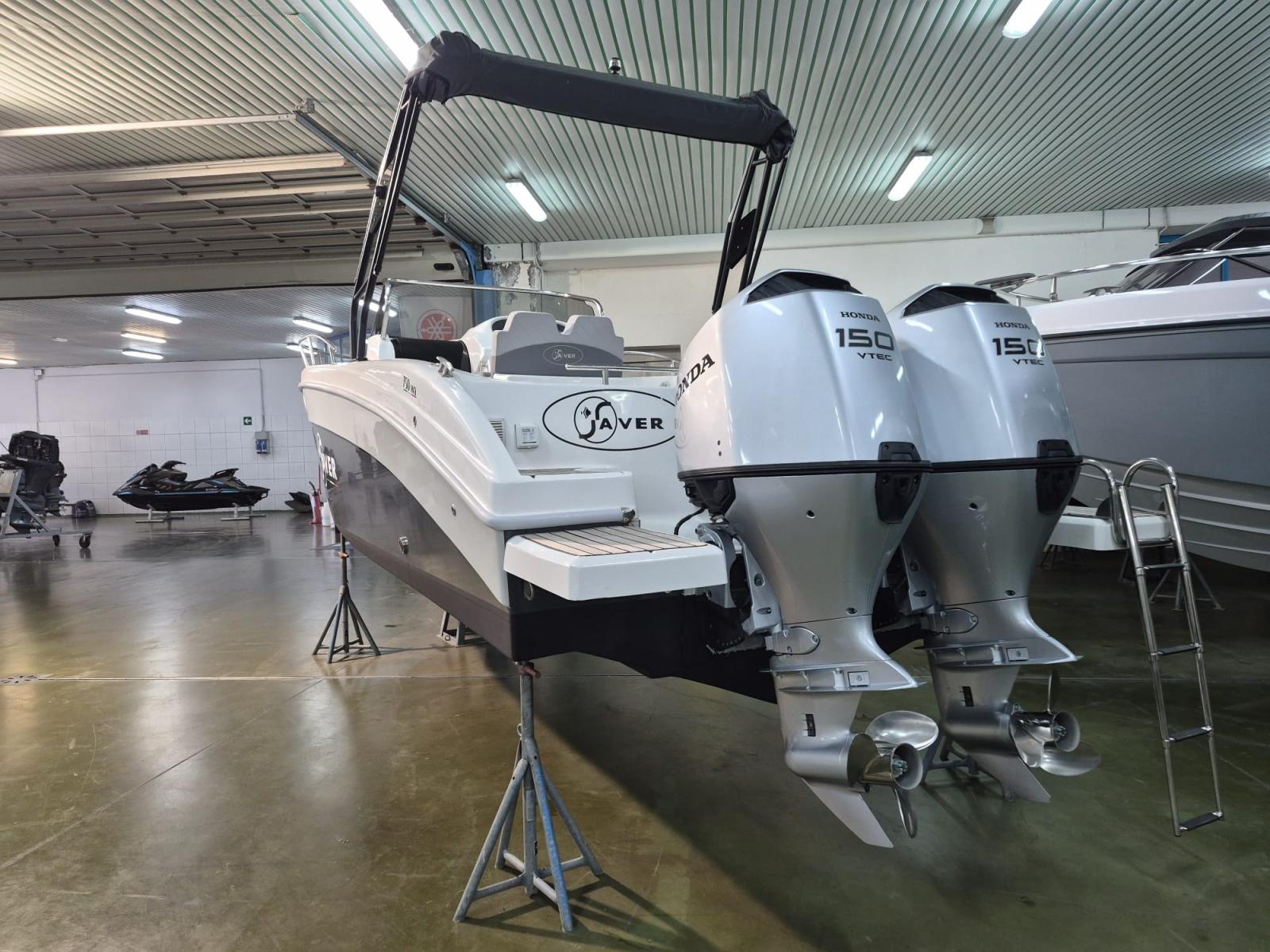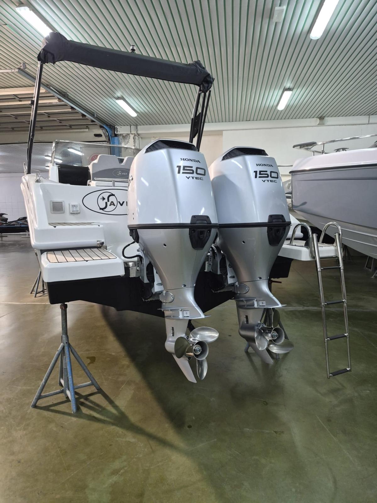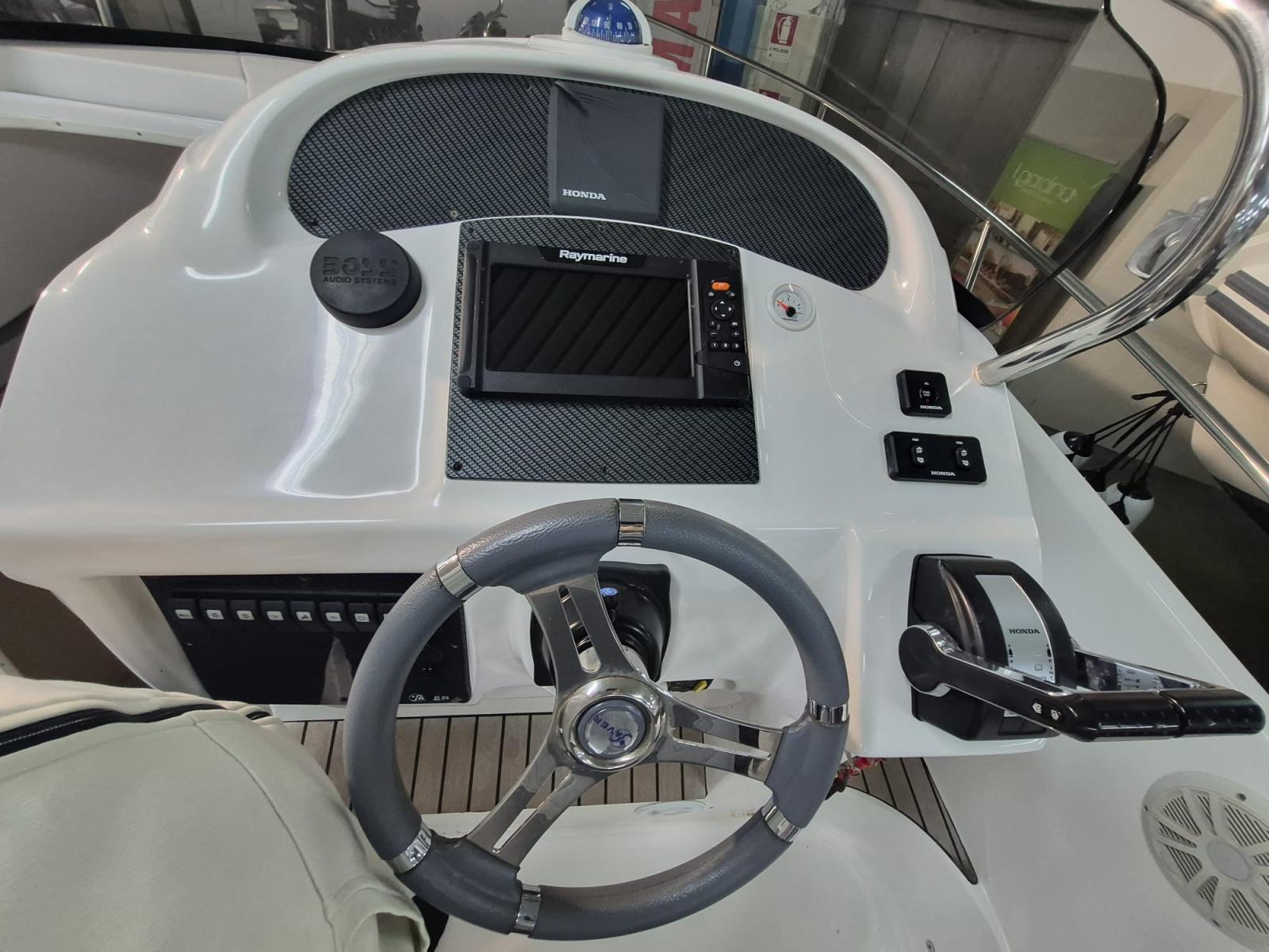 Stereo, ancora elettrica, frigo, cuscineria completa di prolunga prendisole poppa, caricabatterie banchina, plancette poppa, GPS Raymarine. Doppio motore Honda BF150 manetta elettronica.
