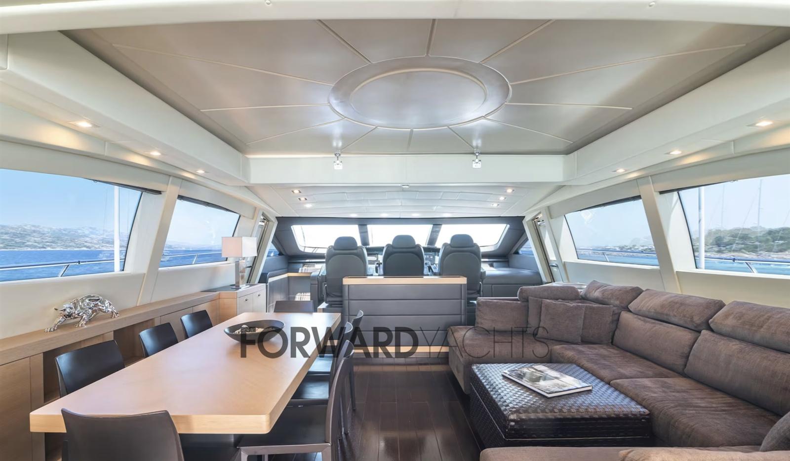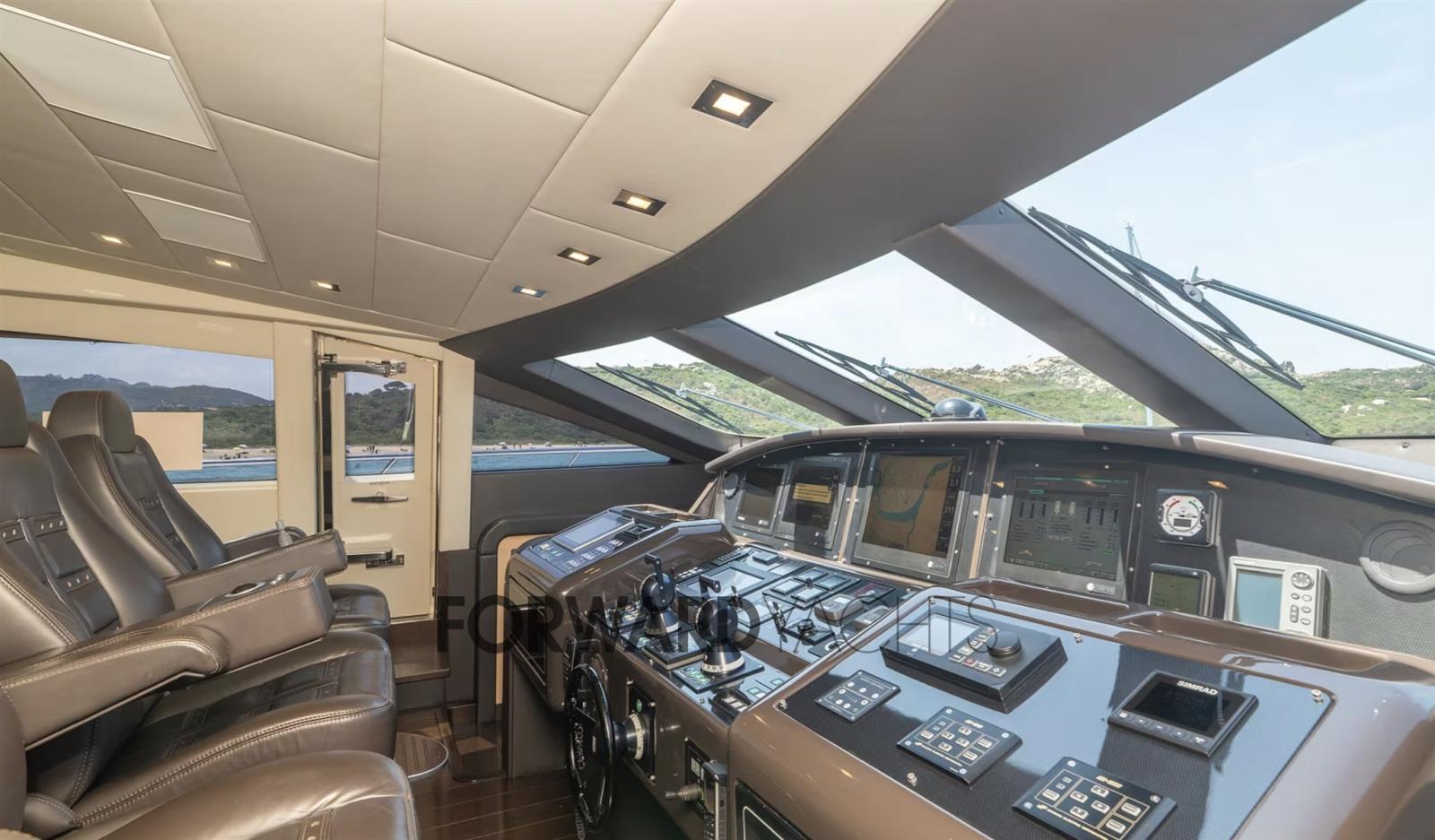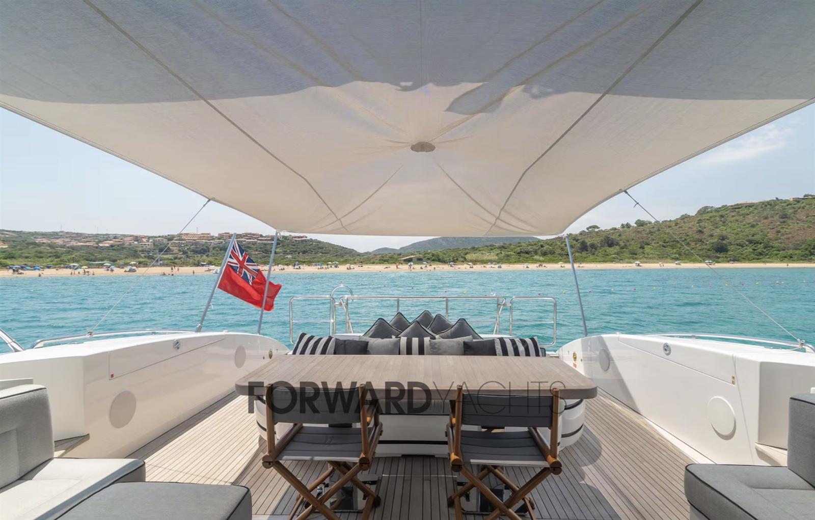 Allarme fumo/gas, Allarme motore, Allarme sentina, Autoclave, Camminamenti laterali in teak, Doccia esterna, Doppia timoneria, Flap idraulici, Garage per tender, Hard top, Impianto antincendio, Indicatori Flaps, Luci di cortesia, Passerella (Idraulica), Piattaforma (Teak), Pompa di sentina automatica, Porta laterale, Pozzetto Teak, Presa 220V banchina, Presa acqua banchina, Raddrizzatore, Salpa Ancore Idraulico, Scaletta da bagno, Sistema Depurazione acque nere, Tender, 2 Winch tonneggio di poppa.