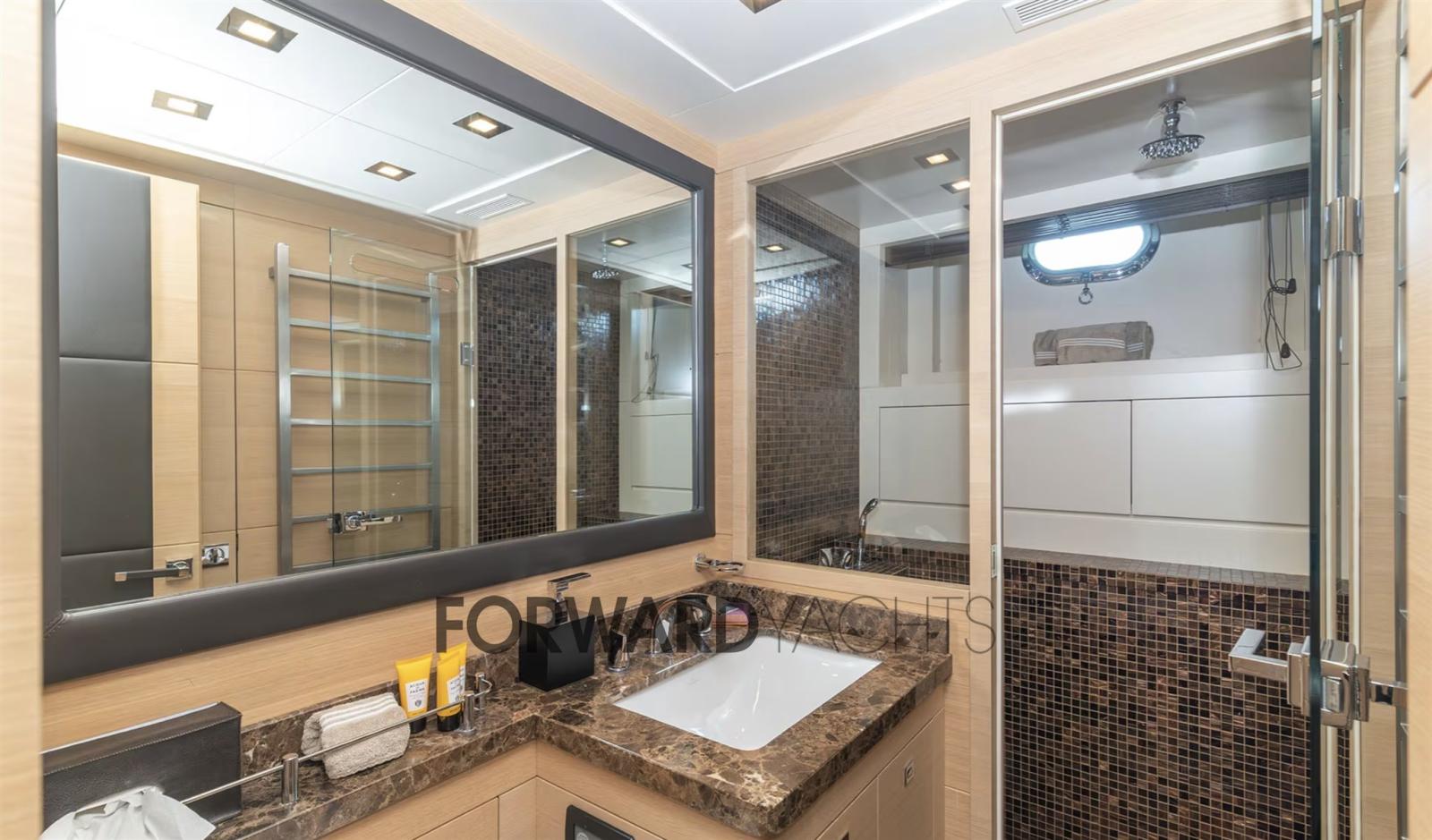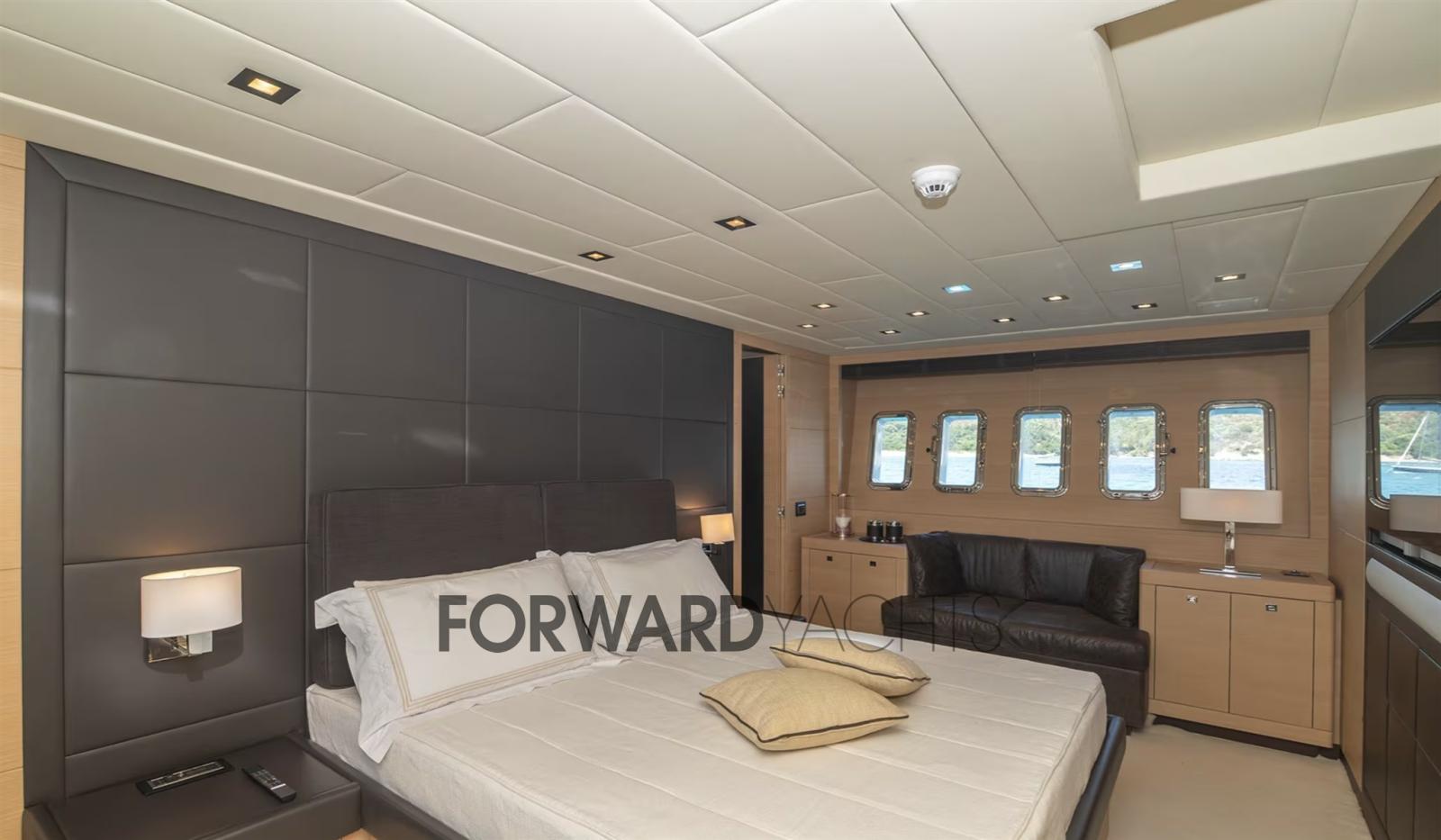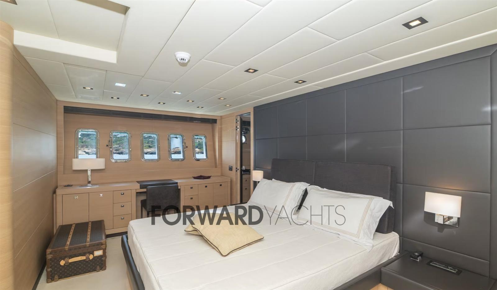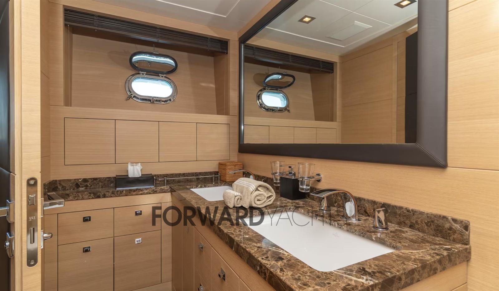 Allarme fumo/gas, Allarme motore, Allarme sentina, Autoclave, Camminamenti laterali in teak, Doccia esterna, Doppia timoneria, Flap idraulici, Garage per tender, Hard top, Impianto antincendio, Indicatori Flaps, Luci di cortesia, Passerella (Idraulica), Piattaforma (Teak), Pompa di sentina automatica, Porta laterale, Pozzetto Teak, Presa 220V banchina, Presa acqua banchina, Raddrizzatore, Salpa Ancore Idraulico, Scaletta da bagno, Sistema Depurazione acque nere, Tender, 2 Winch tonneggio di poppa.