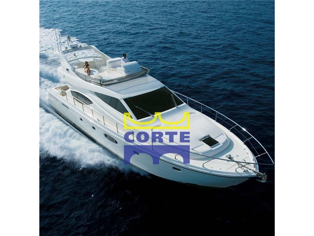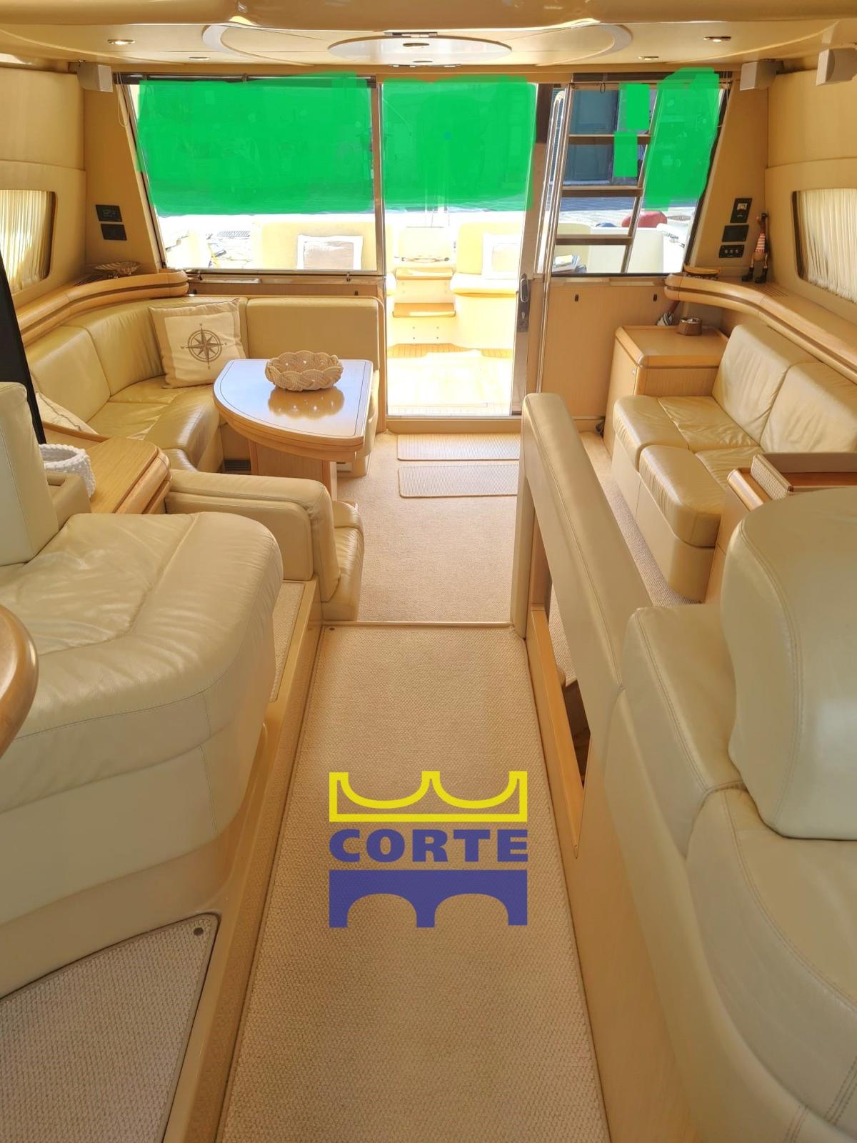 Salone con dinette sopraelevata a destra della plancia con divanetto semicircolare e tavolo, divanetto a 2 posti sx, divano sagomato e tavolo da pranzo allargabile con porta oggetti, frigo bar a cassetto 75 lt 24 V, scala accesso al fly; Cucina attrezzata con forno, frigorifero 181 lt e surgelatore 39 lt 230V, piano di cottura a 4 fuochi vetroceramica, piano di lavoro con 2 lavelli, lavastoviglie, rubinetto acqua salata;