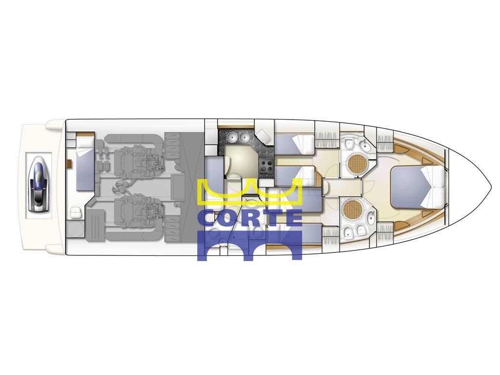 Cabina armatoriale a prua con bagno; Cabina ospiti sx con letti in piano con bagno; Cabina ospiti dx con letti in piano con bagno e vano doccia separato; Cabina equipaggio interna con bagno separato; cabina equipaggio a poppa con bagno.