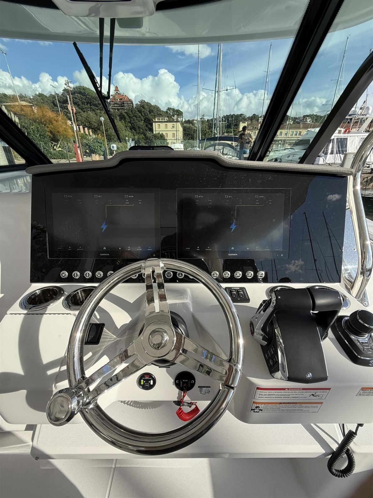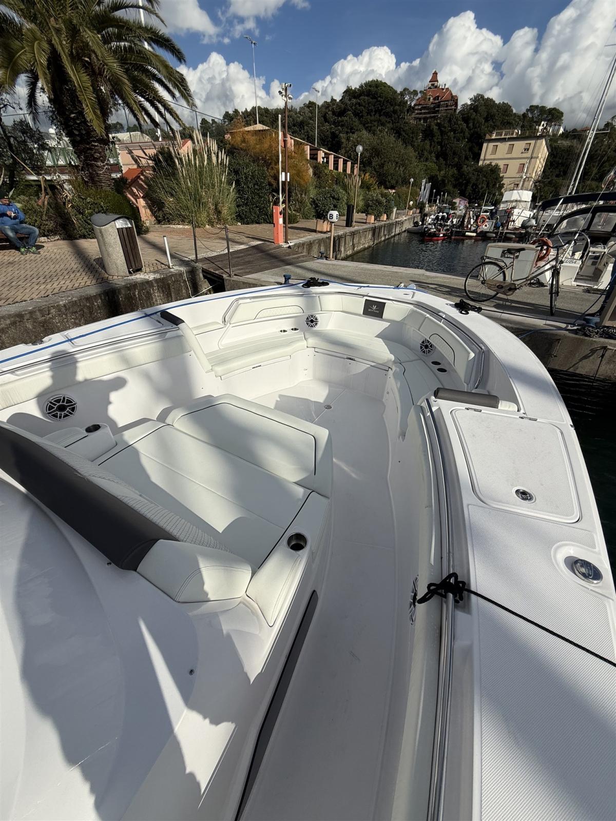 Imbarcazione equipaggiata con 3 x Mercury 400 hp JPO, Vesselview 7", Generatore 9,6 Kw, Seakeeper 3, JL Audio preium system, equipaggiamento da pesca come vasca del vivo 170 l e mobile preparazione esche, elettronica Garmin, luci subacquee cuscinerie e coperture complete.