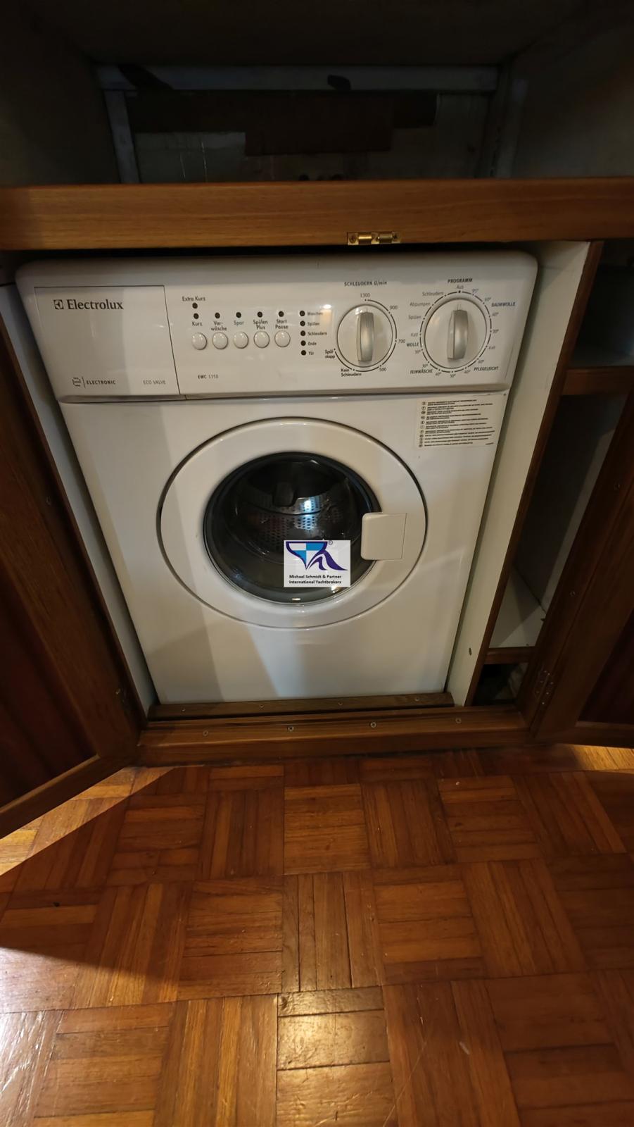Fornello (Gas, 3-flammig, neu), Forno (neu), Frigorifero interno (Kühlbox 12V unter der Salonsitzbank StB), Frigorifero meccanico (neu), Lavatrice (220 V, im Salon).