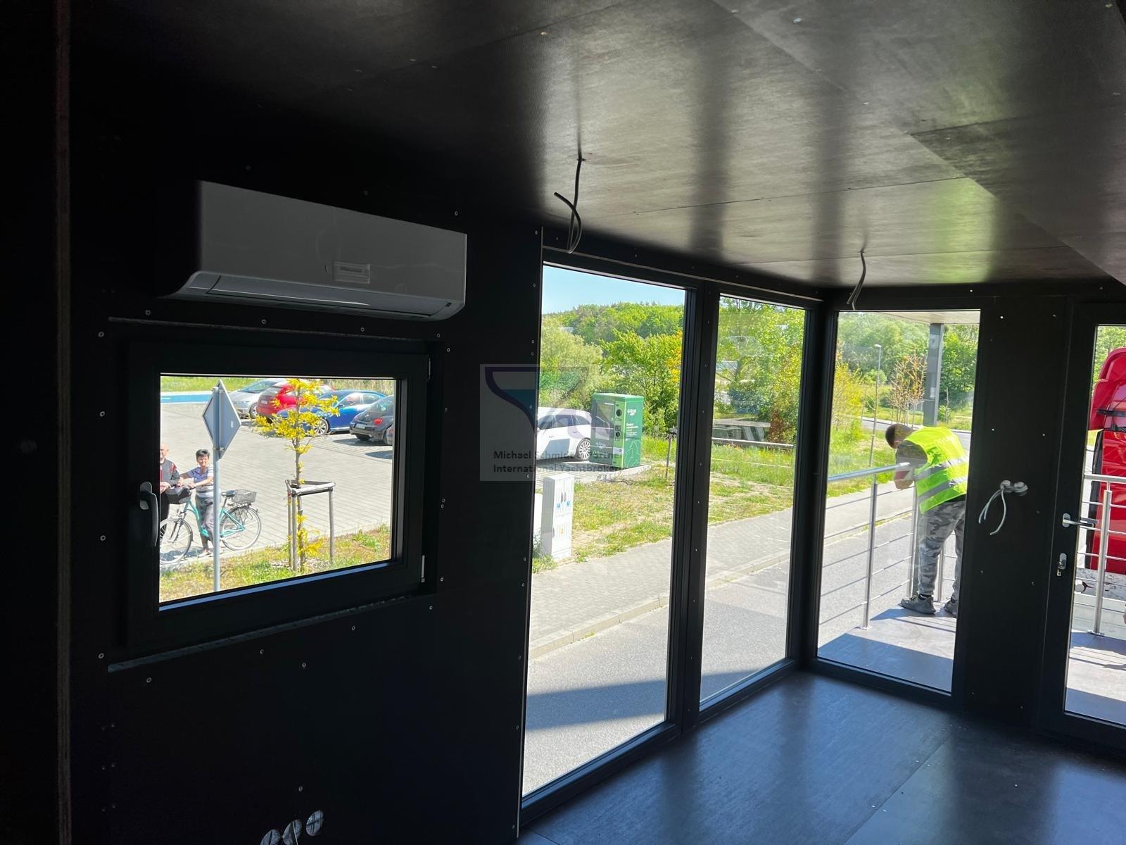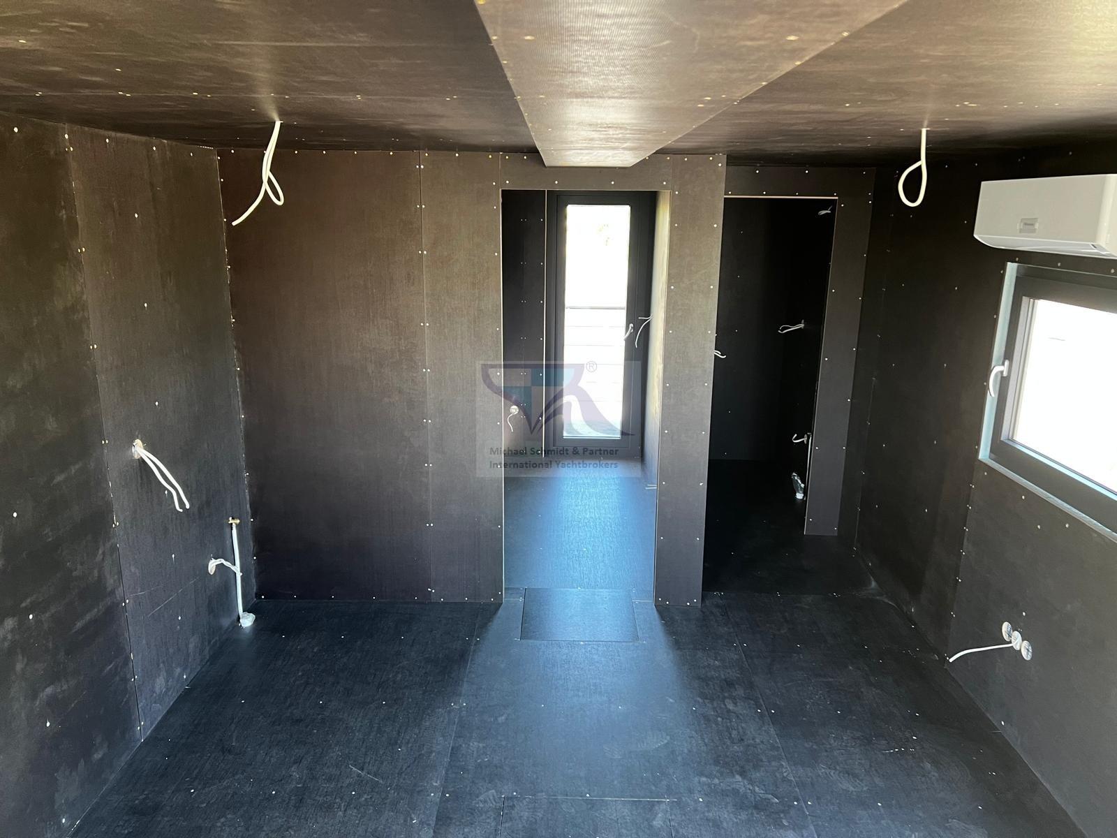 Pareti esterne di locali di servizio termicamente resistenti all'umidità e inumidite acusticamente con polistirolo, pellicola resistente al vapore all'interno e membrana permeabile al vapore e schiuma isolante autoadesiva (sotto la facciata) all'esterno Pareti (comprese le pareti divisorie) riempite con Styrodur e rivestite con pannello per casseforme impermeabile Soffitti realizzati con pannello per casseforme impermeabile