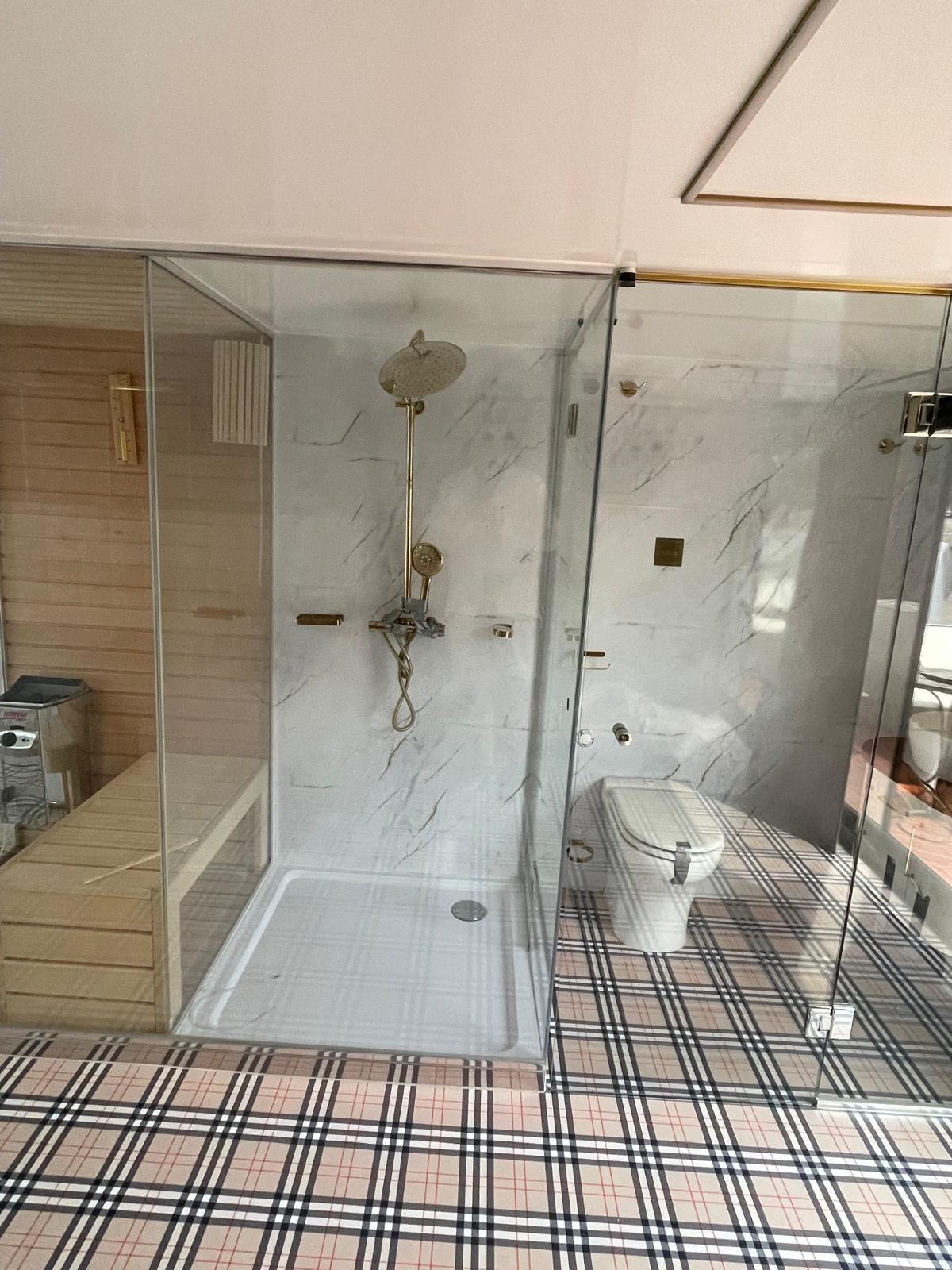 Pavimento Burberry: Un vero attore d'occhio – il pavimento è progettato con il caratteristico motivo a quadri Burberry, conferendo alla stanza un tocco classico britannico elegante con un tocco moderno.