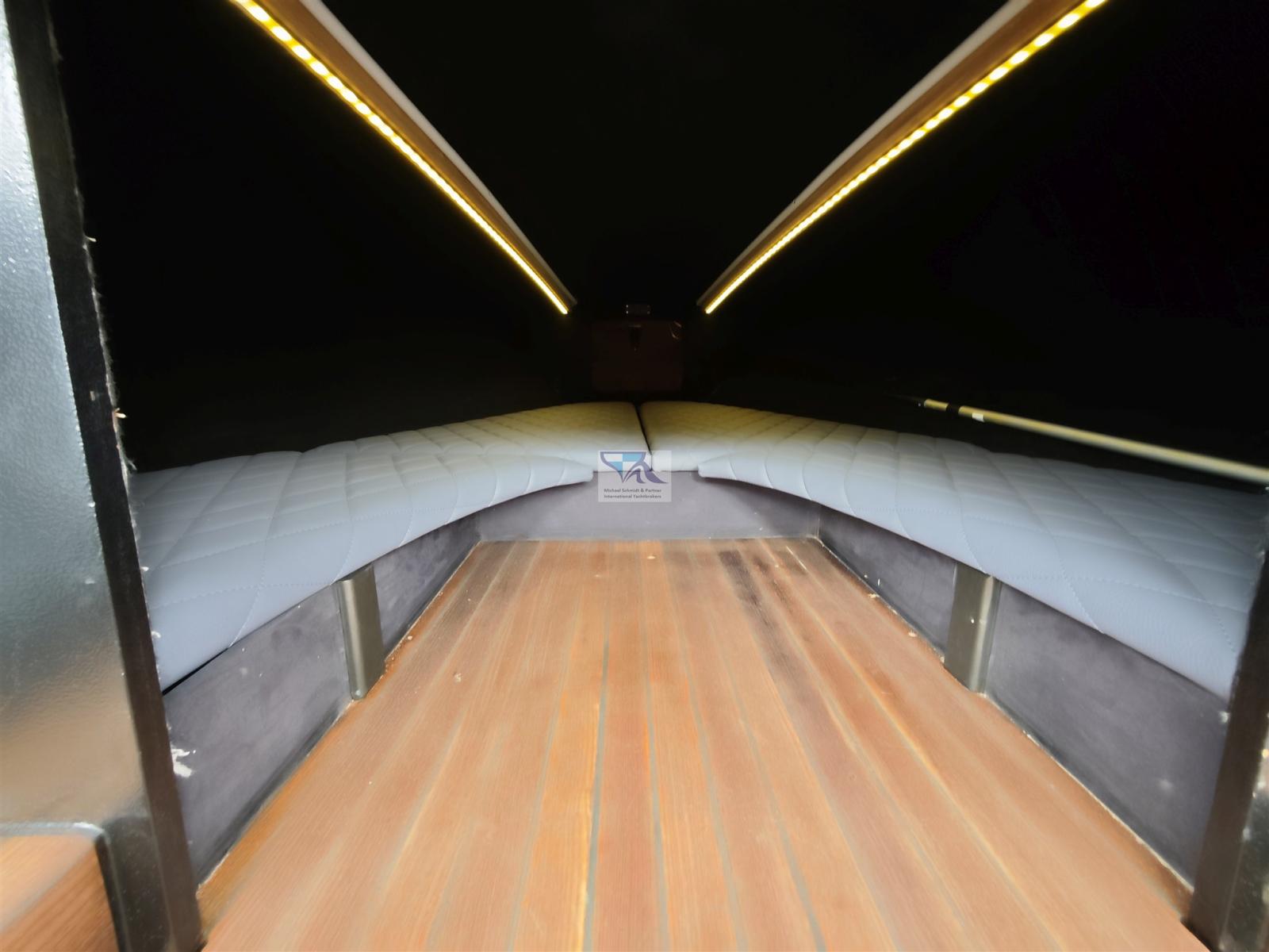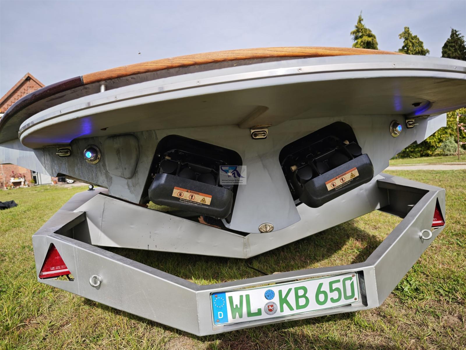 Gioiello unico con una garanzia accattivante! 2 motori a reazione da 277 CV con un pescaggio di soli 0,40 m! Completo di rimorchio in acciaio inox! Interni in pelle speciale di alta qualità come nuovi dal 2023!
