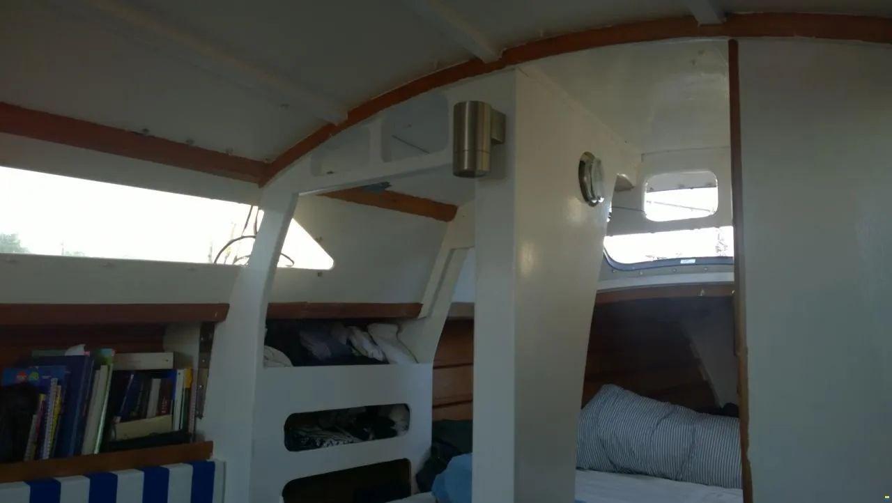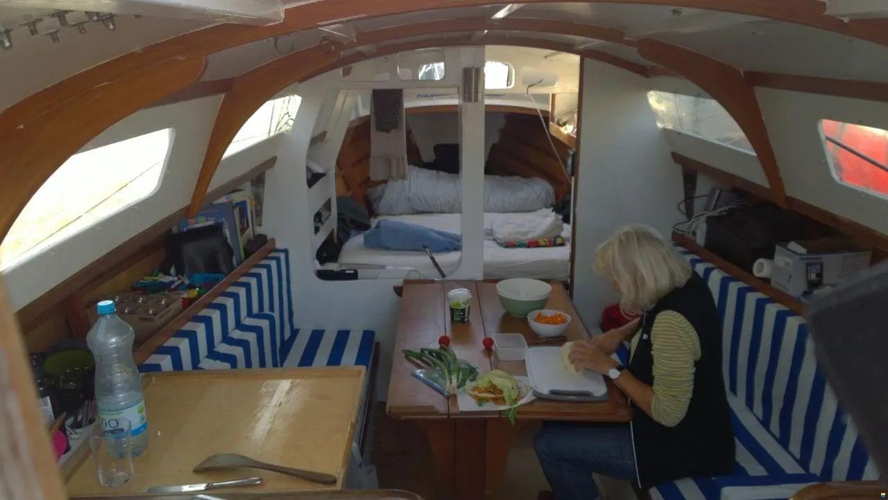 THEA è un moderno (1980!) Costruzione in legno di ciprea/resina epossidica, rivestimento esterno già rivestito con fibra di vetro/resina epossidica durante la costruzione - costruito in Nuova Zelanda. Nuovo albero Selden 2012, nuovo fiocco autovirante Elvström 2017, stecca di fabbricazione vela lorda 2020 (testa grassa - albero accorciato a staffa targa), transponder AIS. Timone parzialmente bilanciato (autocostruito secondo la crepa di Nissen), buono come nuovo interno cambiato nel 2015. Targabügel - scotta randa tedesca.