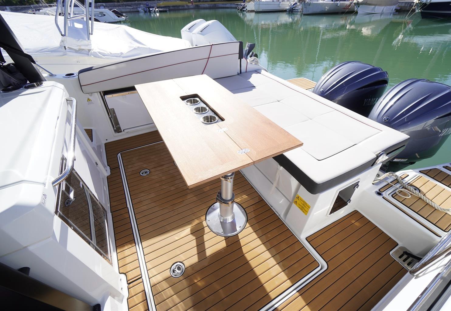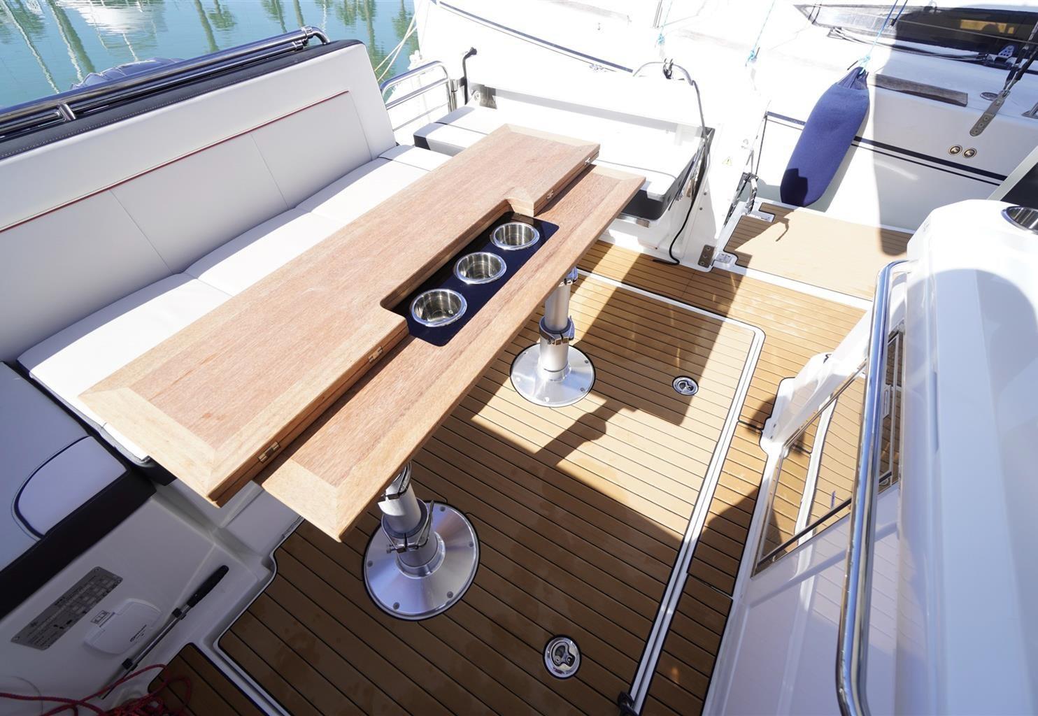 Allarme fumo/gas, Allarme motore, Allarme sentina, 5 Batterie (da 100a), Cavo corrente di banchina, Doccia esterna, Faro orientabile, Flap idraulici, Impianto antincendio, Lavaggio catena, Luci subacquee, Passerella, Pompa di sentina automatica, Pompa di sentina manuale, Pozzetto Teak (Seyteak), Presa 220V banchina, Presa acqua banchina, Salpa Ancore Elettrico, Scaletta da bagno, Tavolo pozzetto, Tavolo Salone Abbattibile, Tromba.