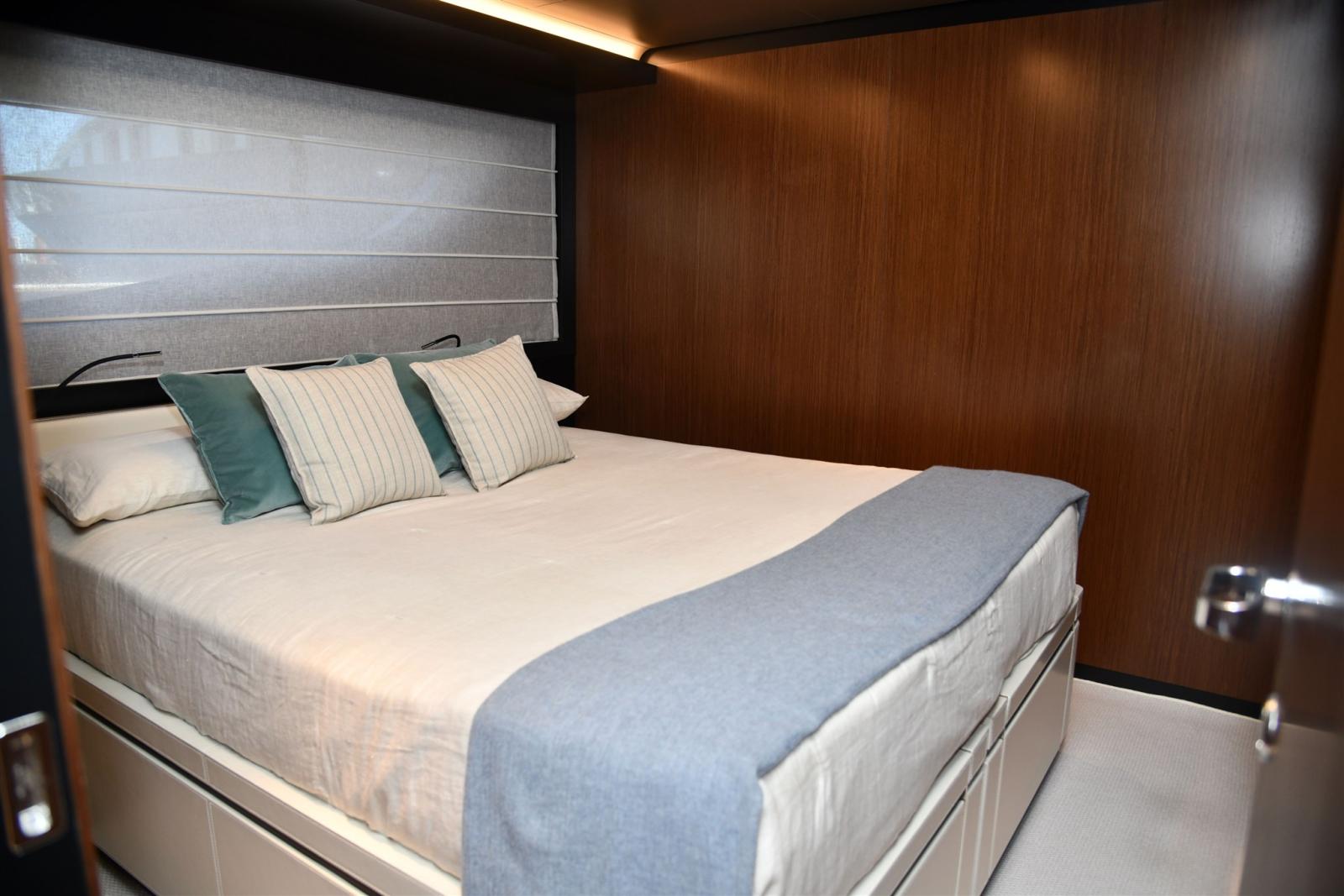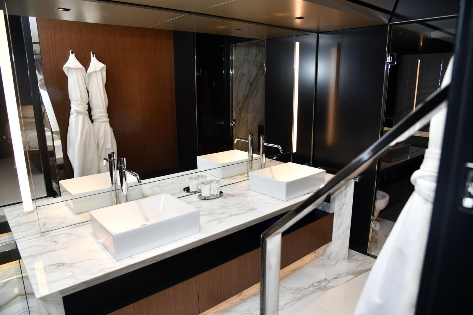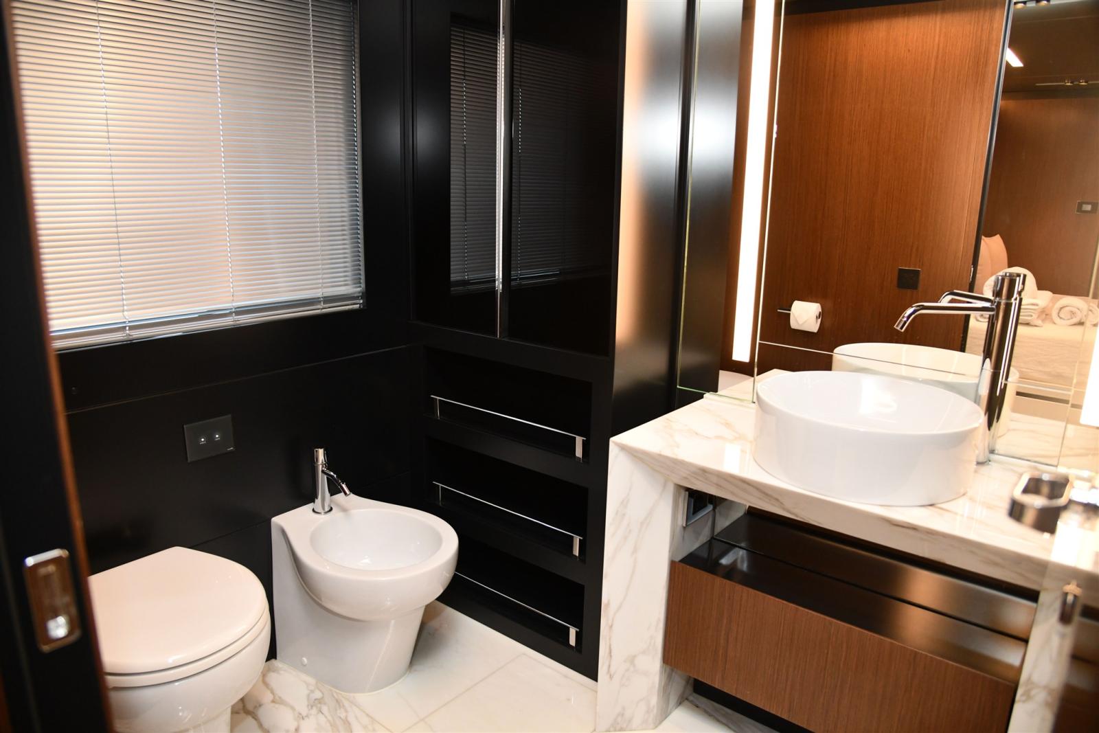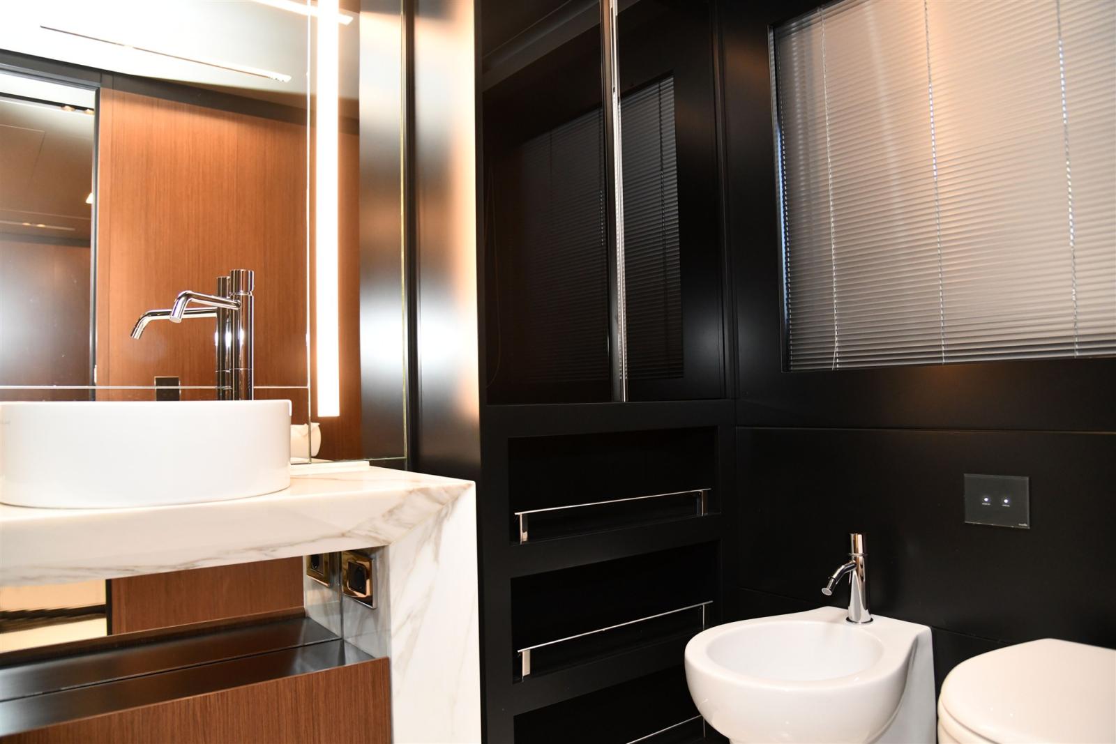 Aria condizionata (super tropic 216000BTU), 2 Boiler, 2 Cassaforte (UNA NELLA CABINA ARMATORE E UNA NELLA CABINA COMANDANTE), Clima reversibile, Collegamento internet, Controllo Domotica, Dimmer per Luci, 2 Dissalatore (Idromar 180 LT), Impianto acque nere (trattamento Hamann), 2 Inverter (24 e 230V PER FRIGORIFERI E SERVIZI DI BORDO), Prese interne 220v, Serbatoio Acque Nere, Telecamera, WC marino elettrico.