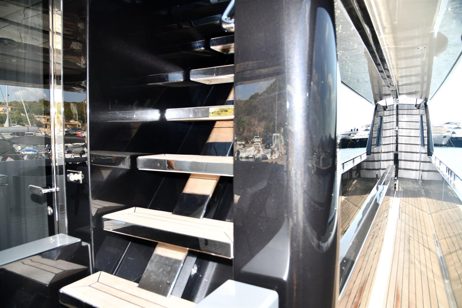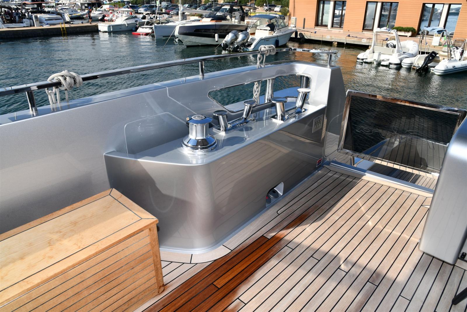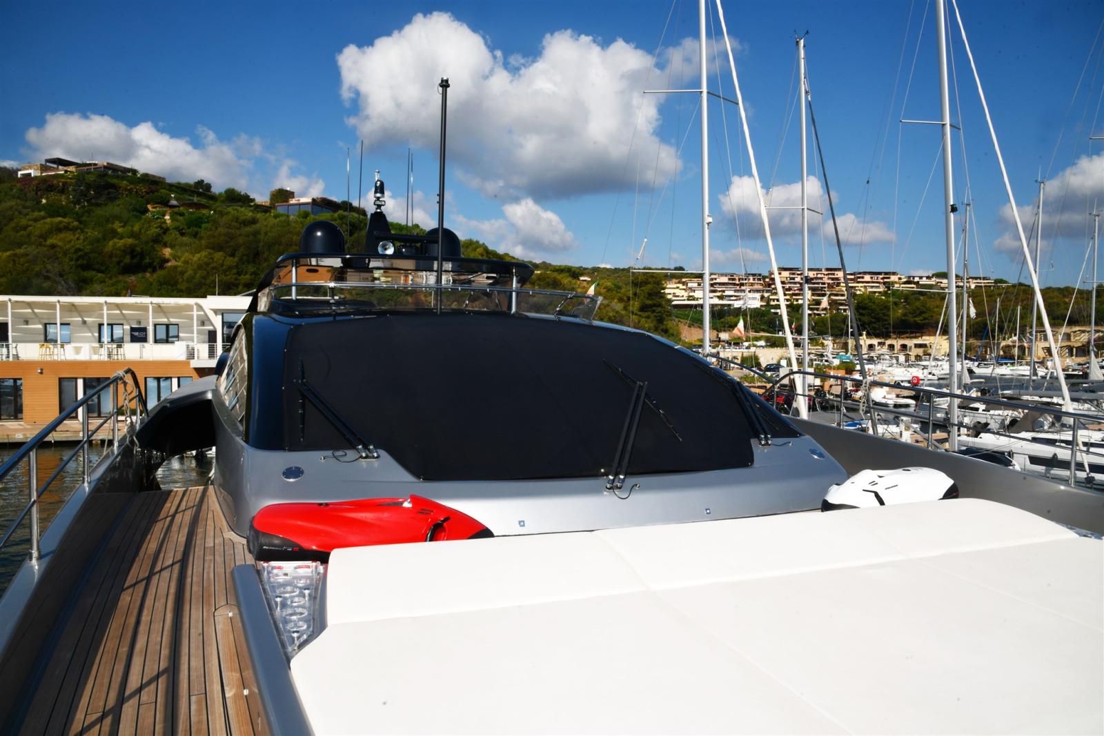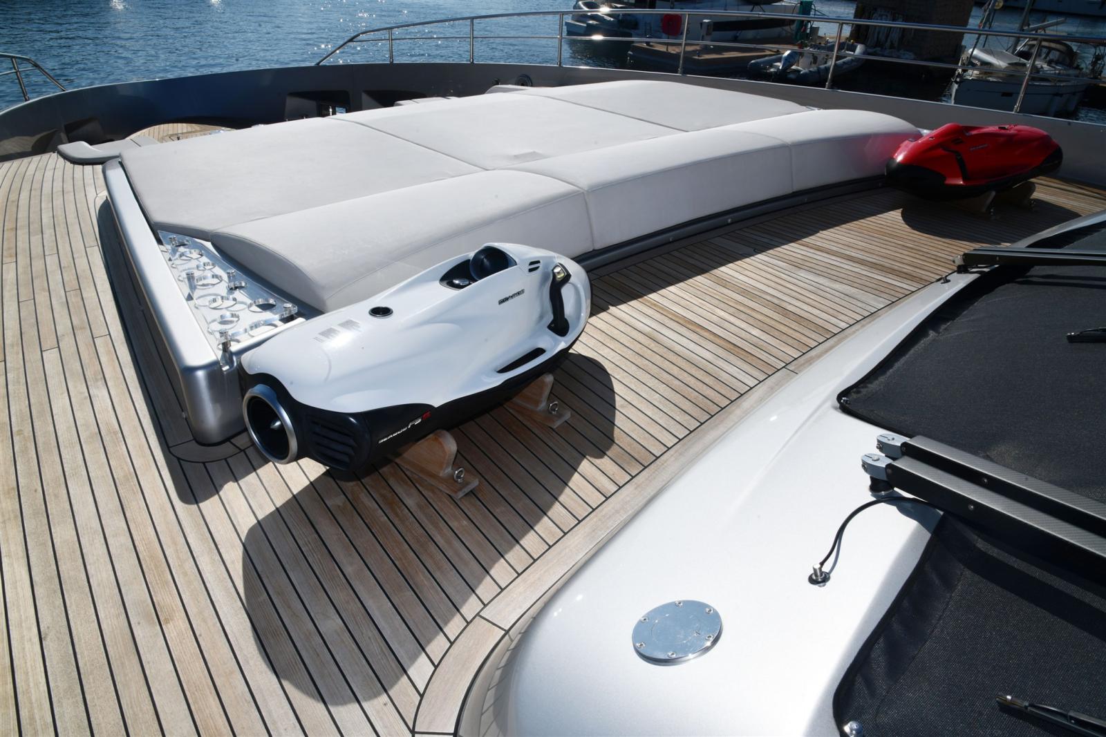 Allarme fumo/gas, Allarme motore, Allarme sentina, Alternatore, 2 Ancora (in acciaio da 105 KG piu 120 MT di catena), 2 Autoclave, Auto-Trim, Batterie (2 gruppi da 24 dedicate ai gruppi motori e servizi), Bitte Abbattibili (SOLO IN PEDANA), Bocche di Lupa, Camminamenti laterali in teak, 3 Caricabatterie (automatico dedicato alle batterie motori e uno dedicato ai servizi), Colorazione speciale (shark grey), Doccia esterna, 2 Doppia timoneria (piu terza a poppa), Elica di poppa - stern thruster (Idraulica), Elica di prua - bow thruster (Idraulica), Fari fissi a poppa, Faro orientabile, Garage per tender, Impianto antincendio, Indicatori Flaps, Lavaggio catena, Luci di cortesia, Luci subacquee, Moto d'acqua, Passerella (a scomparsa idraulica), Pompa di sentina automatica, Pompa di sentina manuale, Pompa Lavaggio Ponte, Porta ingresso (Elettrica), Porta laterale (Elettrica), Pozzetto Teak, Presa 220V banchina, Presa acqua banchina, 3 Raddrizzatore (2 PER SERVIZI 1 PER MOTORI), 2 Salpa Ancore Elettrico, Scaletta da bagno (in carbonio), Selle per Tender (in garage), Sistema Depurazione acque nere, Stabilizzatori (Pinne idrauliche e Seakeeper interno), Tavolo pozzetto (differente), Tender (williams 445 diesel jet), Tientibene con cancelletti, Tromba.