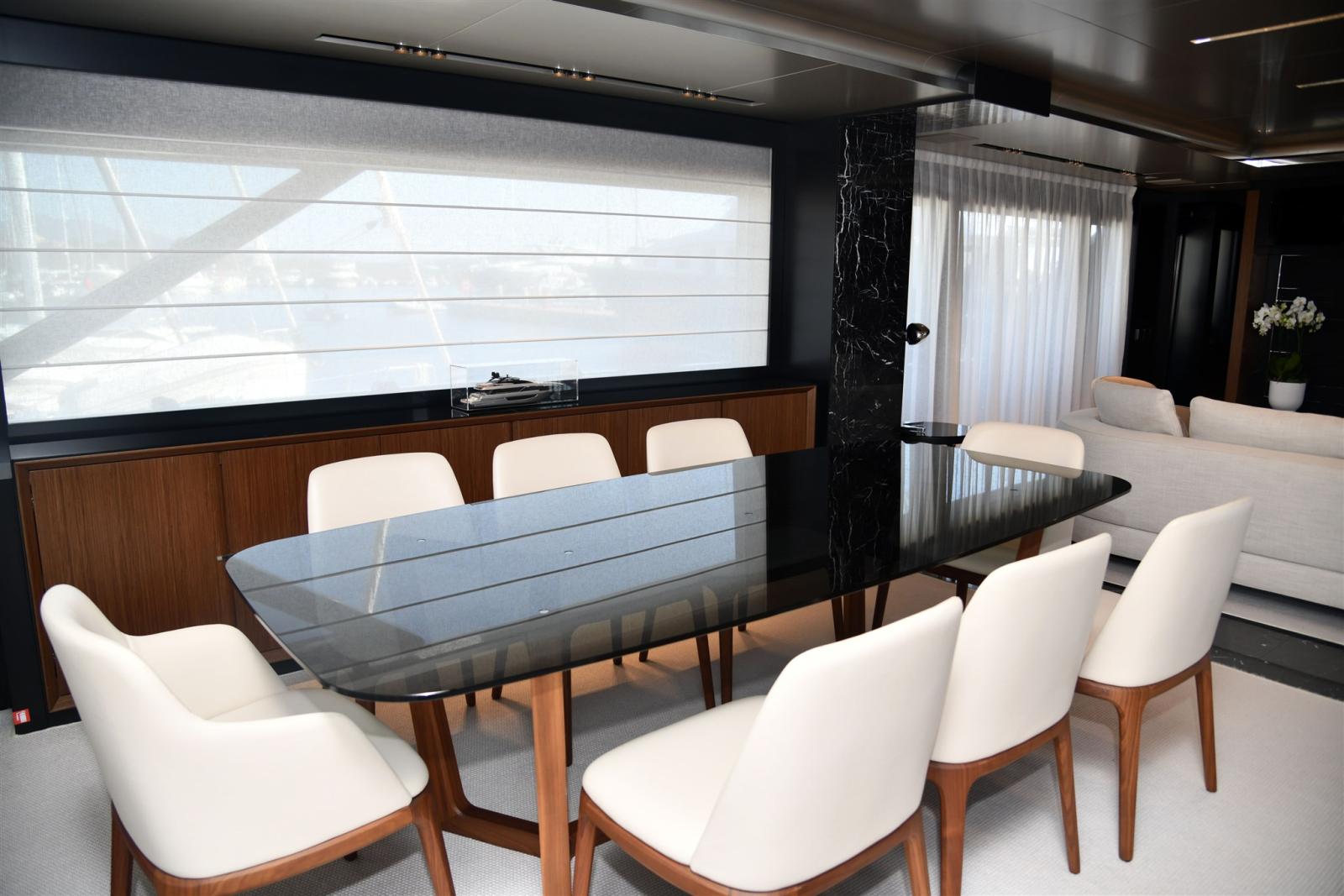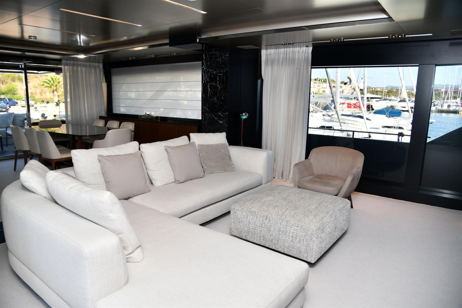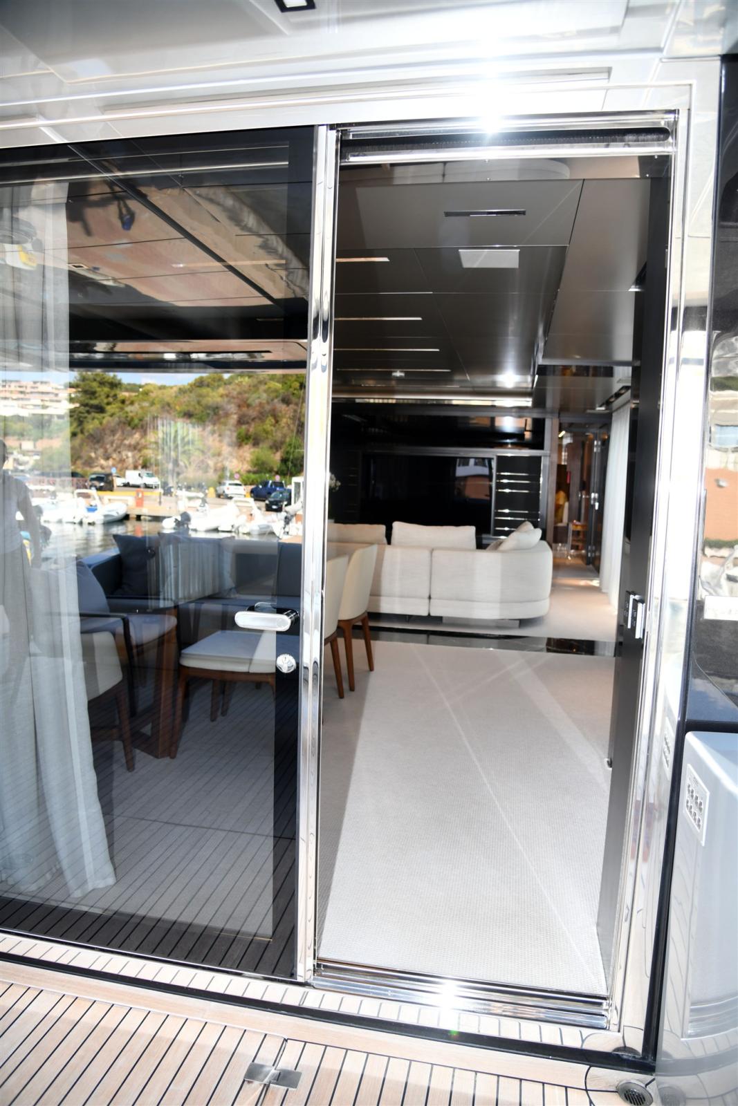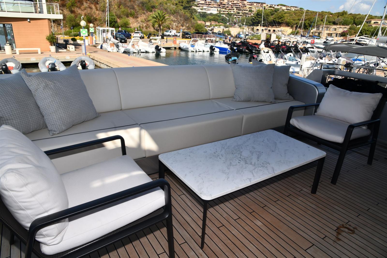 Allarme fumo/gas, Allarme motore, Allarme sentina, Alternatore, 2 Ancora (in acciaio da 105 KG piu 120 MT di catena), 2 Autoclave, Auto-Trim, Batterie (2 gruppi da 24 dedicate ai gruppi motori e servizi), Bitte Abbattibili (SOLO IN PEDANA), Bocche di Lupa, Camminamenti laterali in teak, 3 Caricabatterie (automatico dedicato alle batterie motori e uno dedicato ai servizi), Colorazione speciale (shark grey), Doccia esterna, 2 Doppia timoneria (piu terza a poppa), Elica di poppa - stern thruster (Idraulica), Elica di prua - bow thruster (Idraulica), Fari fissi a poppa, Faro orientabile, Garage per tender, Impianto antincendio, Indicatori Flaps, Lavaggio catena, Luci di cortesia, Luci subacquee, Moto d'acqua, Passerella (a scomparsa idraulica), Pompa di sentina automatica, Pompa di sentina manuale, Pompa Lavaggio Ponte, Porta ingresso (Elettrica), Porta laterale (Elettrica), Pozzetto Teak, Presa 220V banchina, Presa acqua banchina, 3 Raddrizzatore (2 PER SERVIZI 1 PER MOTORI), 2 Salpa Ancore Elettrico, Scaletta da bagno (in carbonio), Selle per Tender (in garage), Sistema Depurazione acque nere, Stabilizzatori (Pinne idrauliche e Seakeeper interno), Tavolo pozzetto (differente), Tender (williams 445 diesel jet), Tientibene con cancelletti, Tromba.