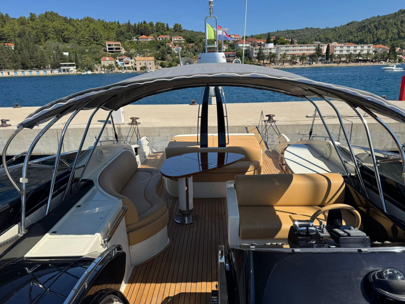 Camminamenti laterali in teak (plancetta poppa), Doccia esterna, Passerella (Hydraulic), Pompa di sentina manuale, Pozzetto Teak, Scaletta da bagno, Tavolo pozzetto.