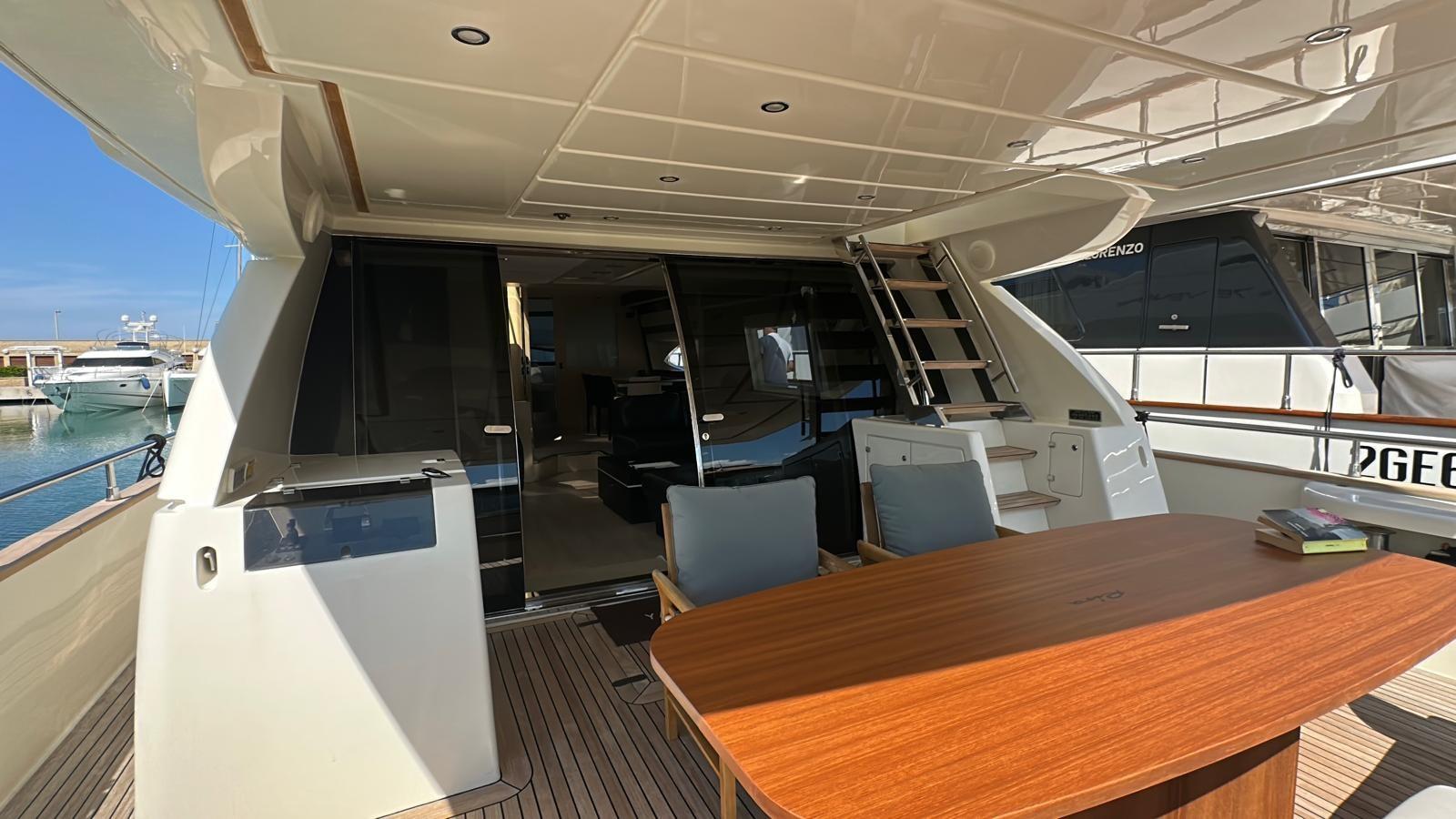 Autoclave, Camminamenti laterali in teak, Doccia esterna, Doppia timoneria, Flap idraulici, Garage per tender, Impianto antincendio, Impianto Aria Compressa, Indicatori Flaps, Lavandino nel Pozzetto, 10 Luci subacquee, Passerella, Ponte in teak, Porta laterale, Pozzetto Teak, Presa 220V banchina, Presa acqua banchina, Salpa Ancore Elettrico, Scaletta da bagno, 2 Stabilizzatori, Tavolo pozzetto, 2 Winch tonneggio di poppa, Winch tonneggio di prua.