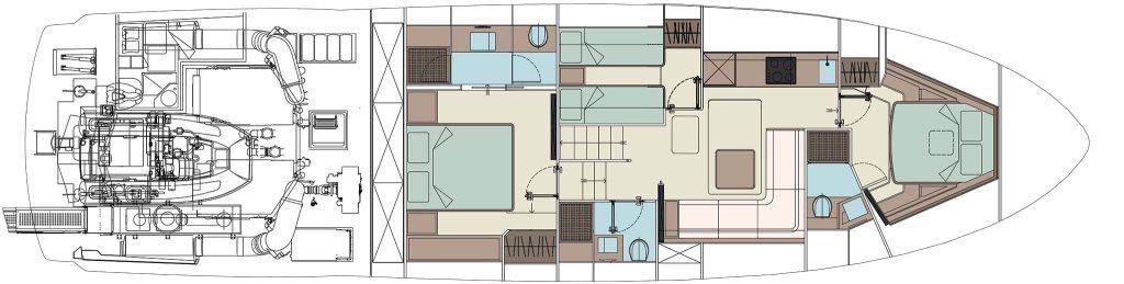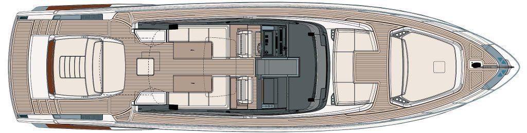 Camminamenti laterali in teak (con comento grigio), Luci di cortesia, 6 Luci subacquee (2 a poppa e 4 laterali), Pozzetto Teak (con comento grigio), Scaletta da bagno (idraulica), Stabilizzatori (Seakeeper NG9).