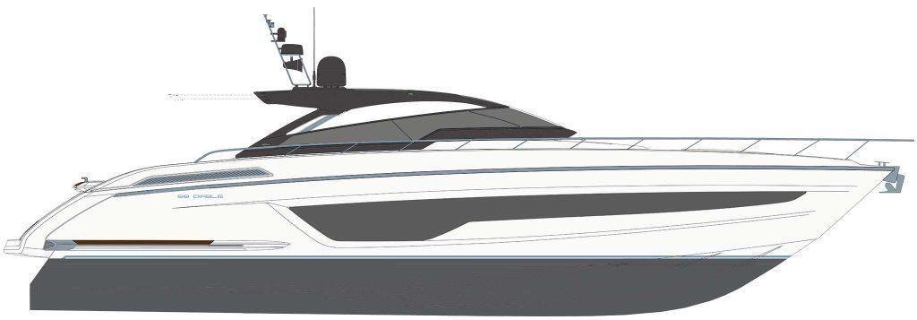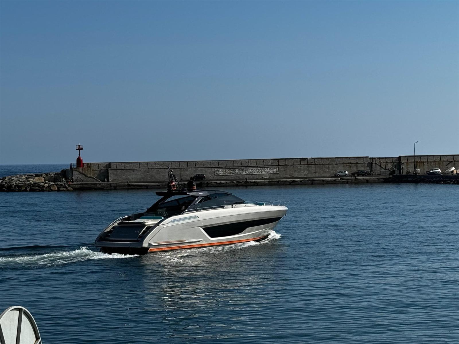 Realizzato in vetroresina con elegante finitura Argento Riva, lo yacht può accogliere fino a 16 persone.