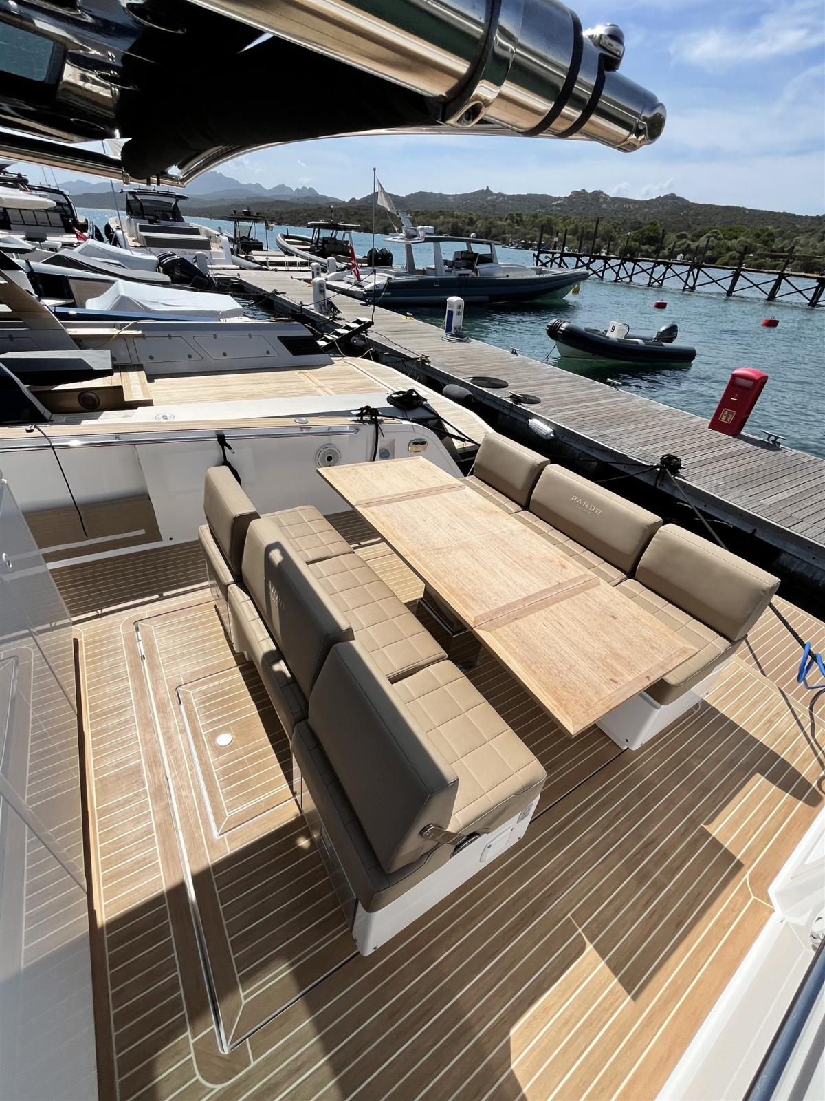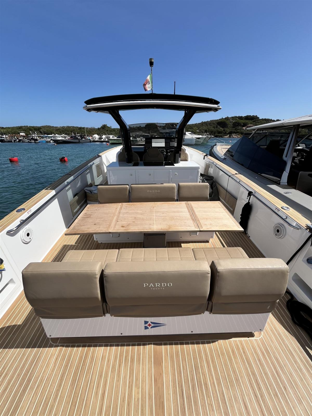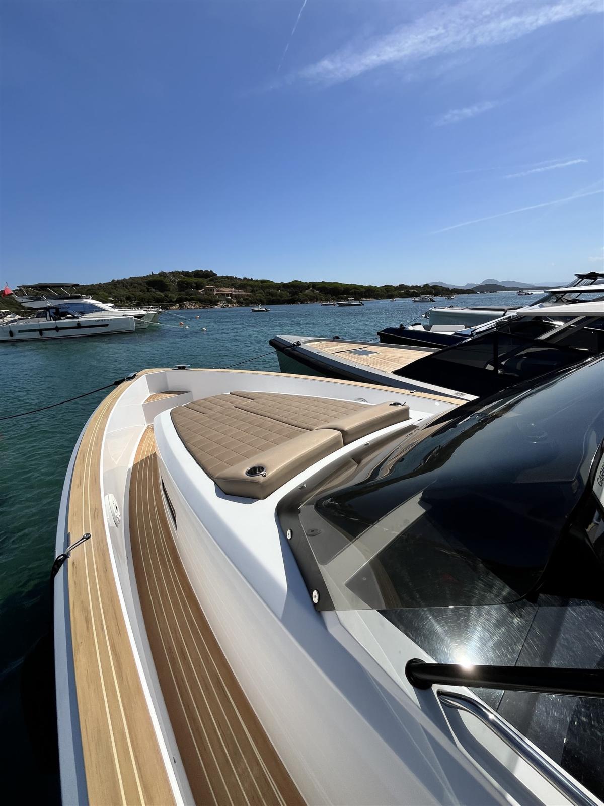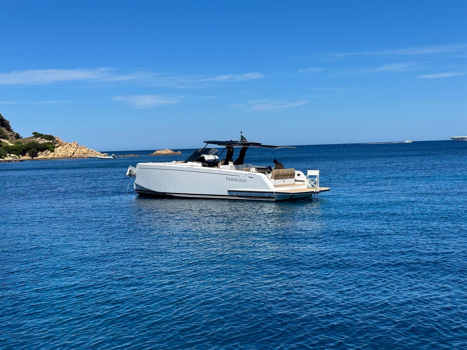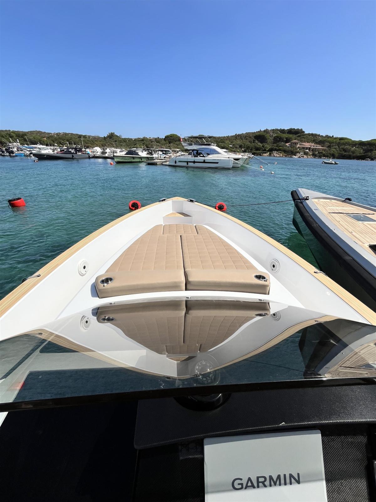 Ancora (13 kg 50m de chaine avec système électrique pour davier), 4 Batterie, Caricabatterie (60amp/h), Luci di cortesia (led), 2 Luci subacquee, Piattaforma (rallongé), Scaletta da bagno (confortable), Tavolo pozzetto (electrique avec coussin), T-Top (noir de carbone), Tuga in teak (Flexiteek).