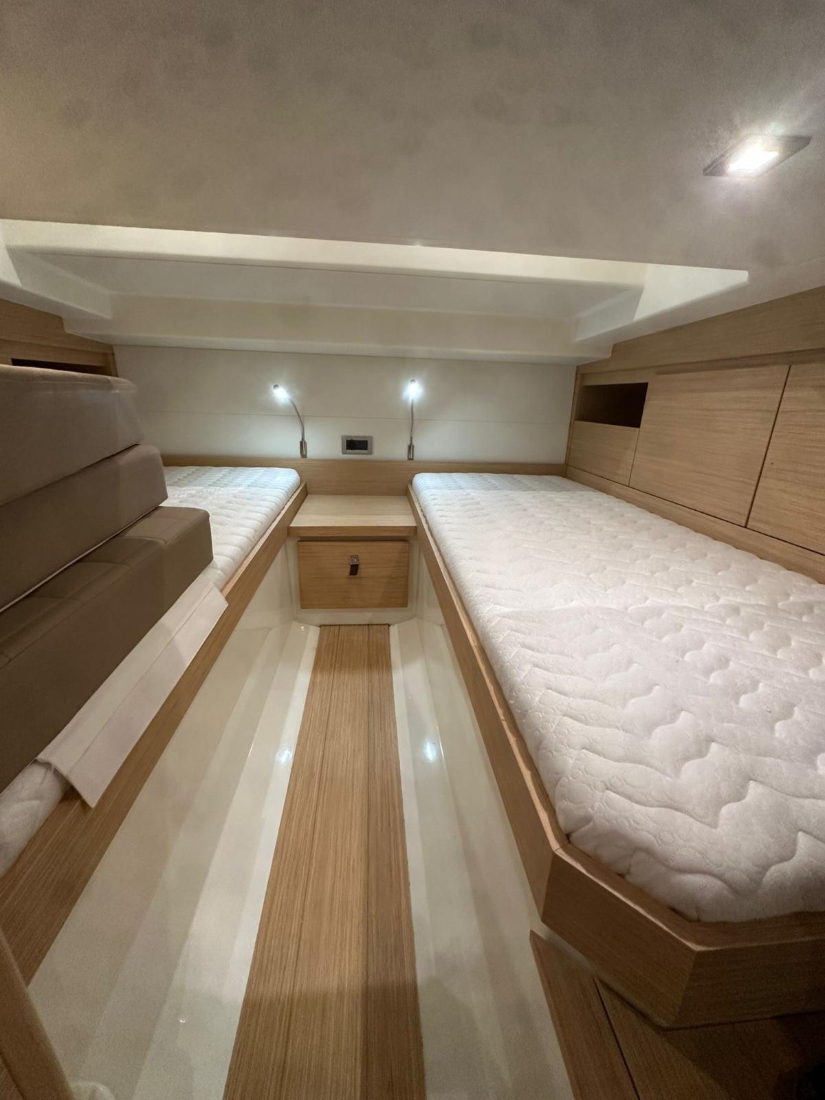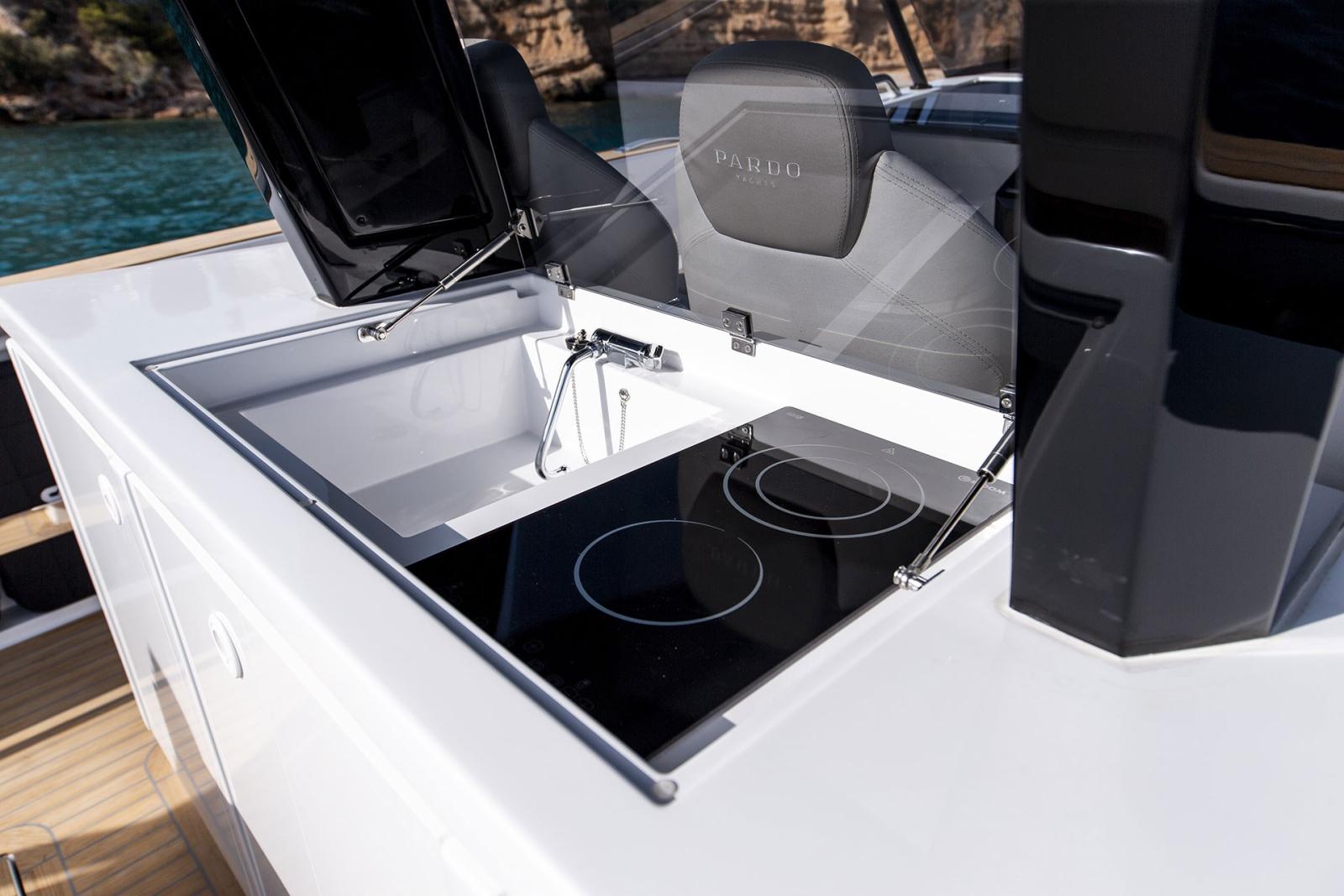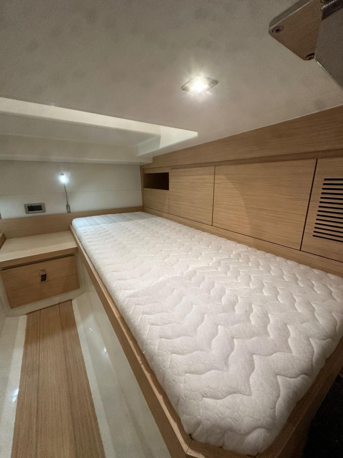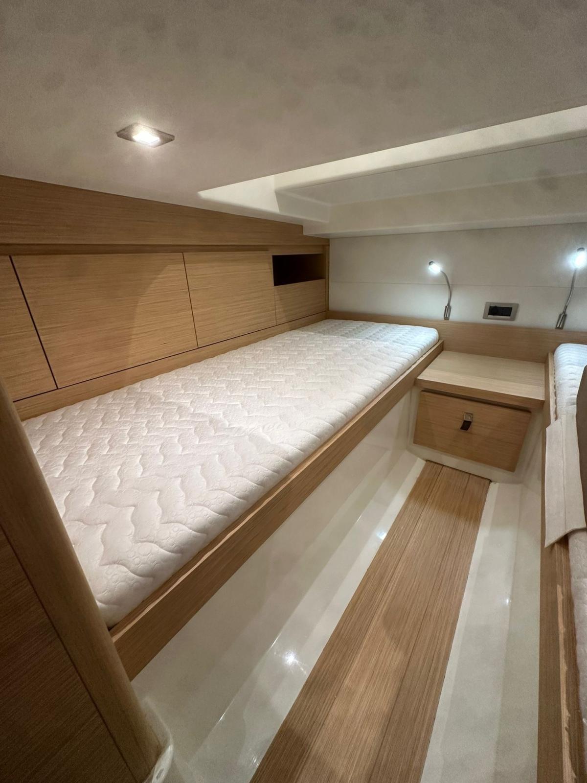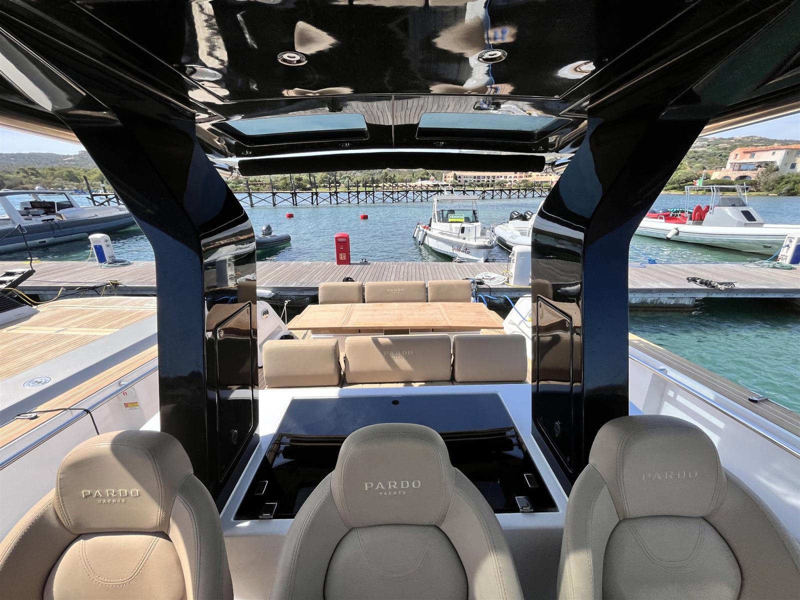 Ancora (13 kg 50m de chaine avec système électrique pour davier), 4 Batterie, Caricabatterie (60amp/h), Luci di cortesia (led), 2 Luci subacquee, Piattaforma (rallongé), Scaletta da bagno (confortable), Tavolo pozzetto (electrique avec coussin), T-Top (noir de carbone), Tuga in teak (Flexiteek).