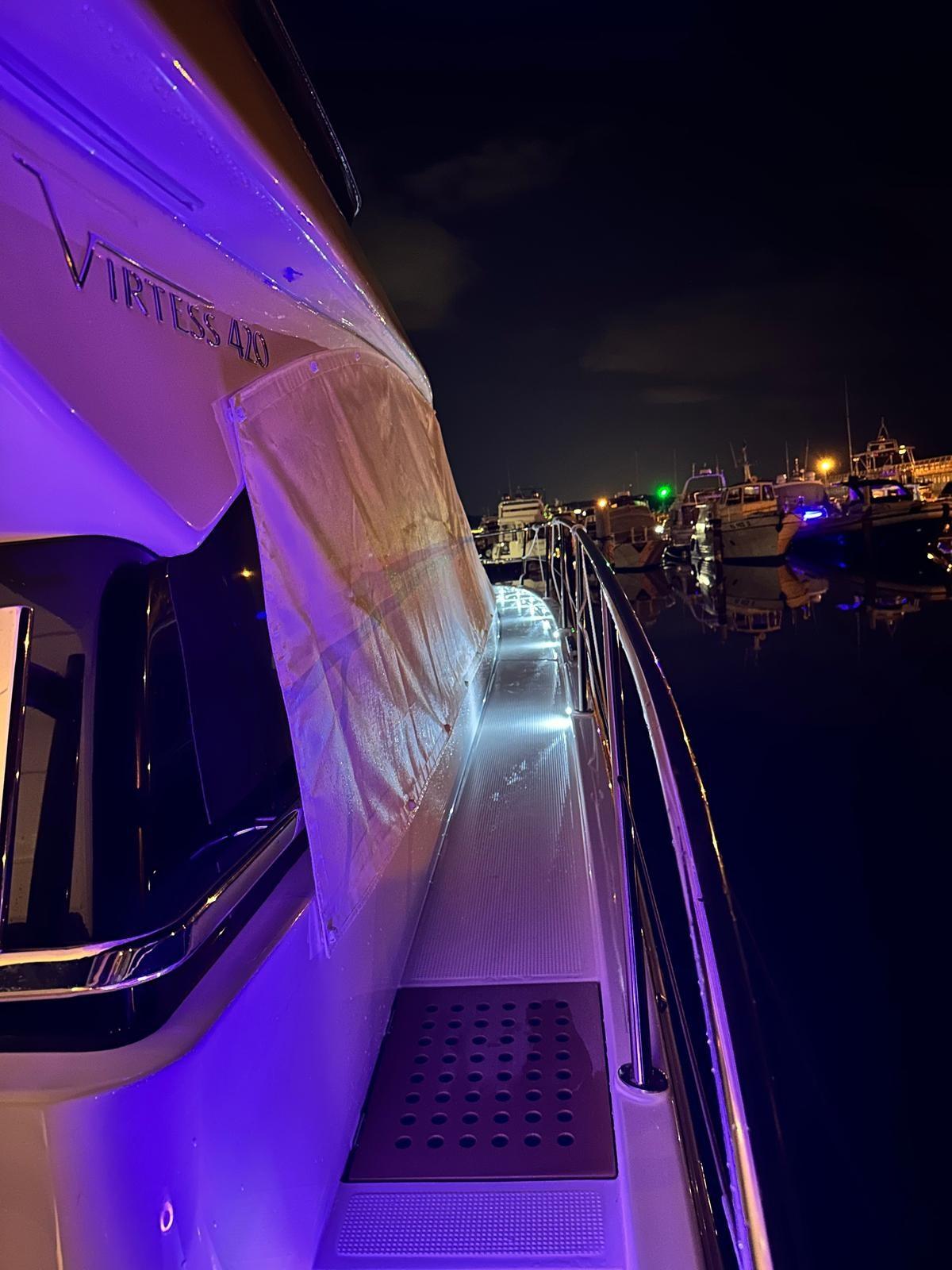 Allarme motore, Autoclave, Doccia esterna, Flap elettrici, Lavandino nel Pozzetto, Luci di cortesia, Luci subacquee, Piattaforma (Idraulica), Porta ingresso, Pozzetto Teak (Teak sintetico), Presa 220V banchina, Presa acqua banchina, Salpa Ancore Elettrico, Scaletta da bagno, Tavolo pozzetto (Movibile), Tavolo Salone Abbattibile, Tromba.