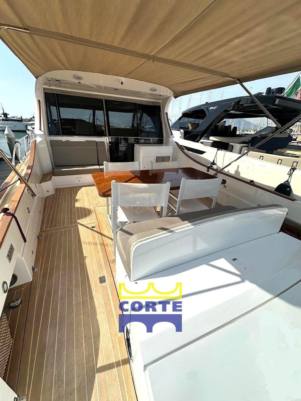 Ampio pozzetto con comoda divano e tavolo a sei posti. Mobile con piastra barbecue e frigo. Accesso alla cabina equipaggio, attrezzata completa di servizi igienici.
