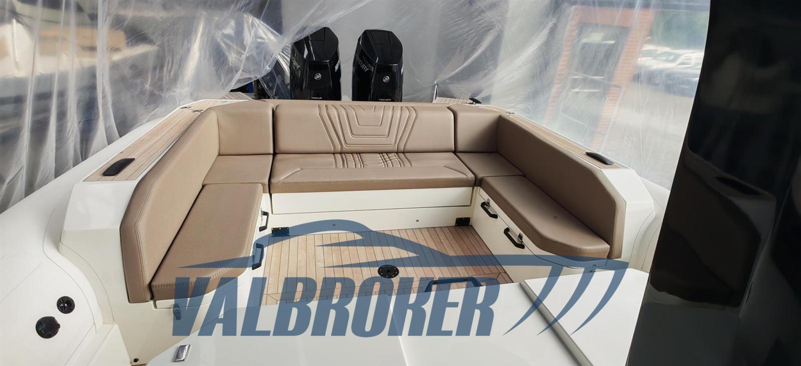 Vano apribile a prua con cabina marinaio (materasso e prese USB). Colore murate BIANCO. 2x400HP Mercury V10.