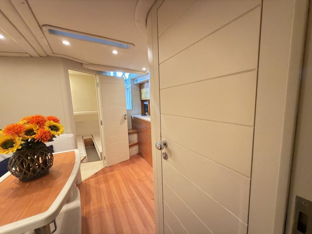 Autoclave, Cavo corrente di banchina, Colorazione speciale (Fascia blu nelle fiancate), Doccia esterna, Flap elettrici, Lavandino nel Pozzetto, Luci di cortesia, Passerella (a scomparsa), Pozzetto Teak, Presa 220V banchina, Salpa Ancore Elettrico.