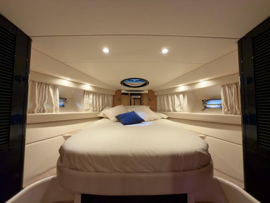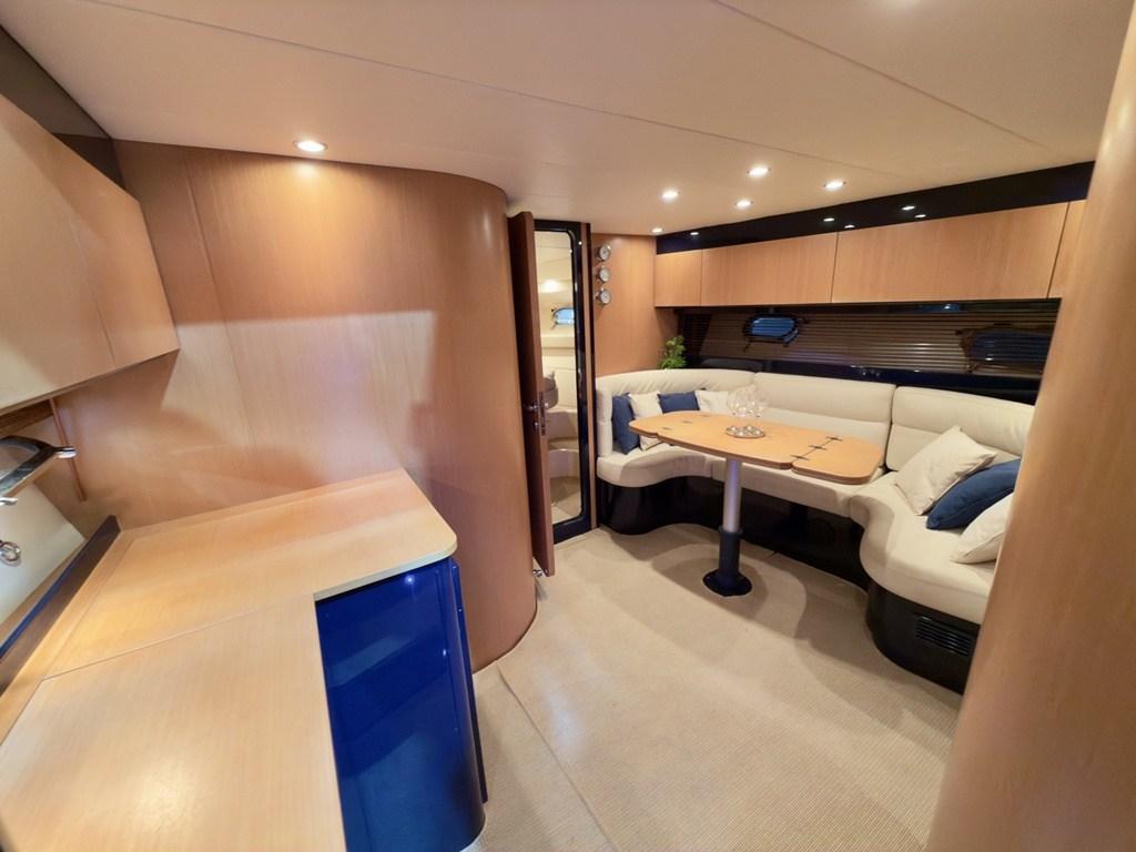 Gli interni, luminosi e ariosi, offrono una cabina armatoriale a prua con bagno indipendente, un salone con cucina e una cabina ospiti particolarmente ampia e confortevole, data la sua collocazione a centro barca.