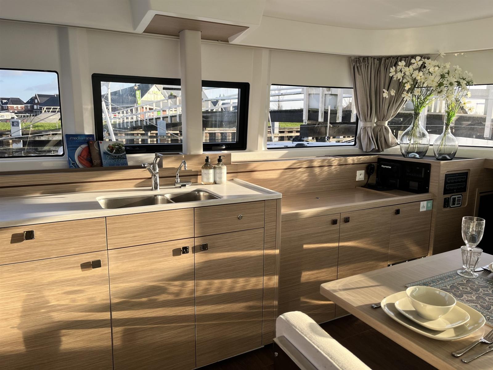 Congelatore (80 liter), Cucina, 4 Fornello (Gas), Forno (Force 10), Frigorifero esterno (Cockpitlade met 2 koellades á 144 liter), Frigorifero interno (Frontlade van 154 liter & schuiflade van 64 liter).