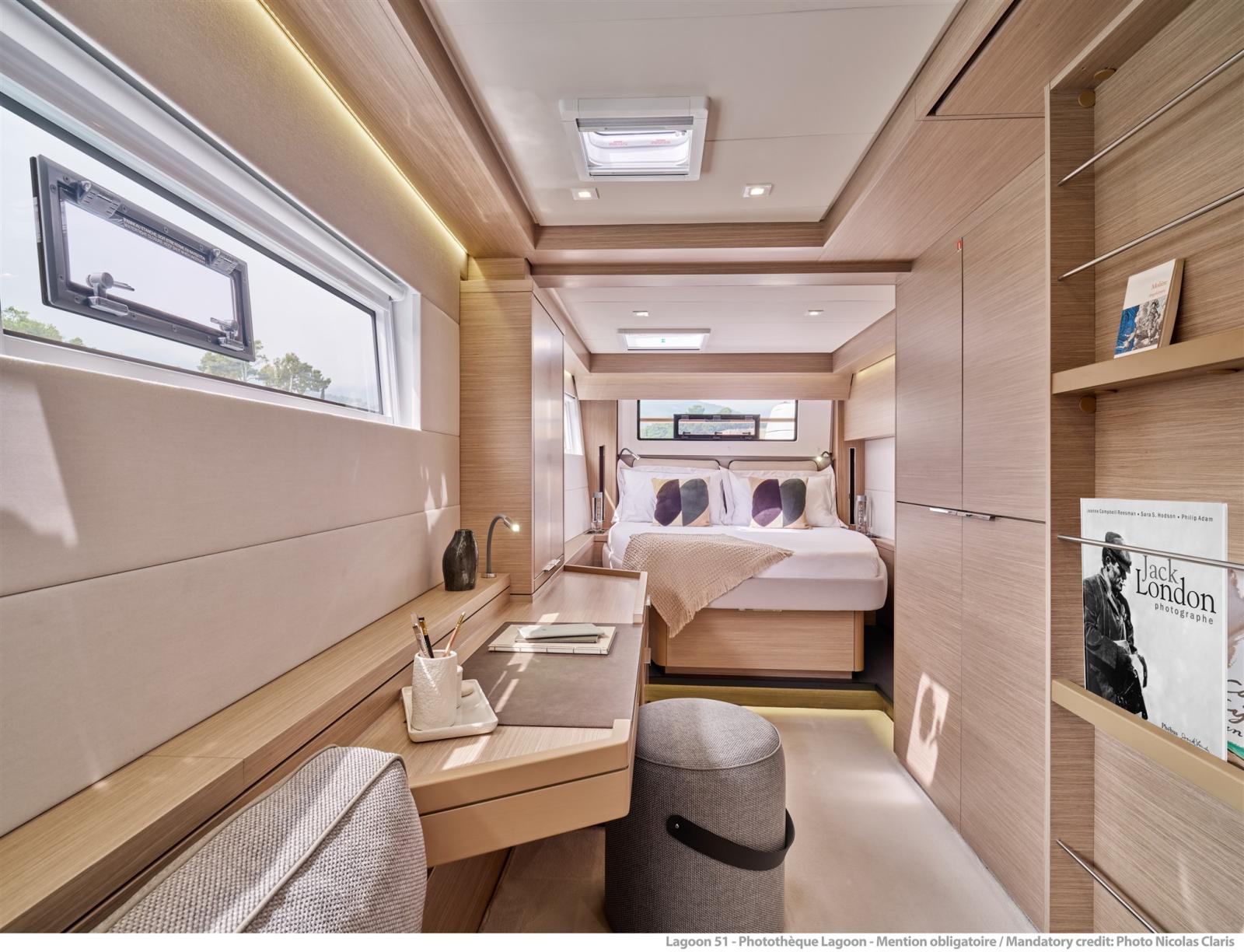 Entrate nello spazioso salone e scoprite l'innovativo concetto di spazio. Poiché l'albero è posto all'estremità anteriore del salone, non ostruisce la vista dal salone. Questo spazio è inondato di luce grazie alle finestre verticali a 360°. La nuova finitura del legno "Alpi sand oak" esalta questa sensazione di spaziosità. Ovunque tu sia, il volume di questo salone è impressionante e permette una facile circolazione. Inoltre, offre tutte le soluzioni pratiche che ci si aspetta su una Lagoon. La cabina del proprietario beneficia anche di questa ottimizzazione del layout e offre una grande cabina armadio di serie.