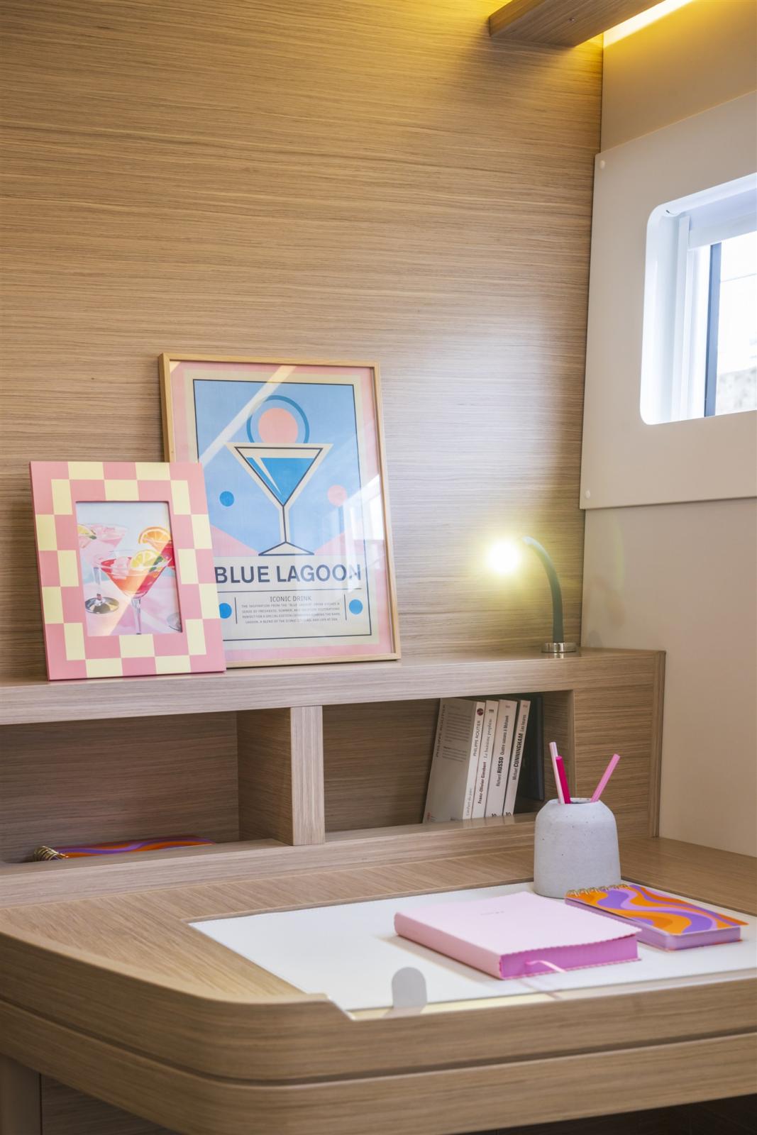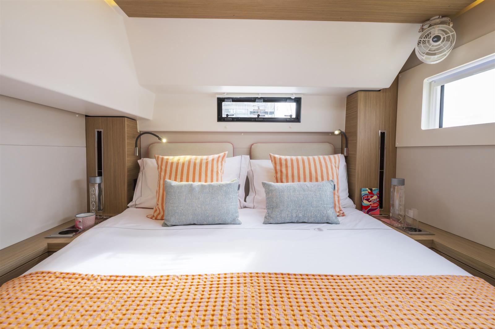 - La versione a 3 cabine offre una cabina armatoriale con uno spazio abitativo molto spazioso e servizi igienici propri che coprono l'intero scafo. Inoltre, nell'altro scafo troverete 2 spaziose cabine per gli ospiti, entrambe dotate di servizi igienici propri con lavandino, cabina doccia e toilette separata.