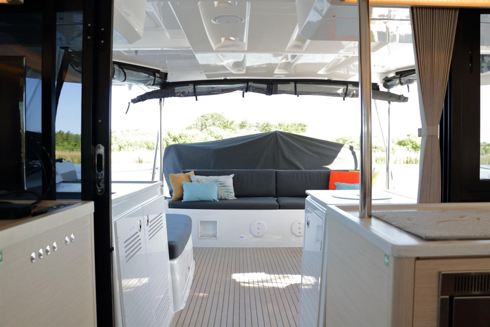 Cabina di pilotaggio spaziosa, passerella e bimini extra-large completamente chiudibili con tela e terrazza solare – ottimi luoghi per momenti conviviali a bordo