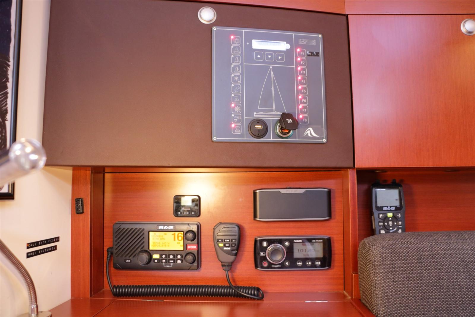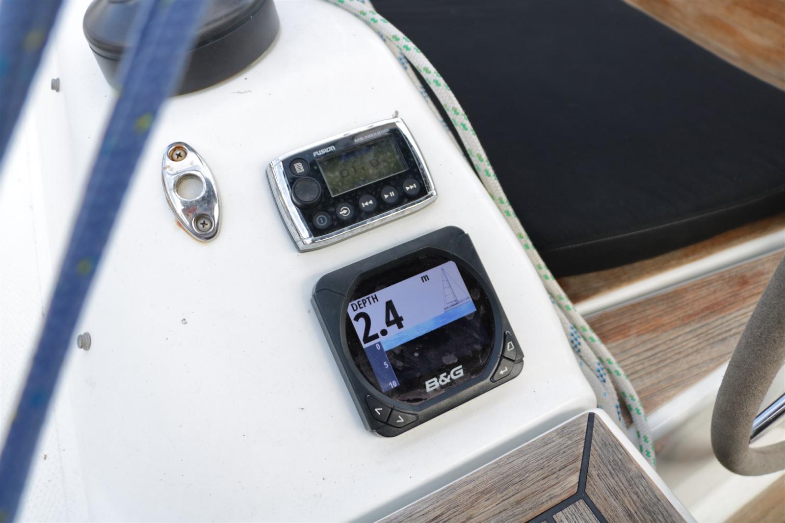 AIS (Easy TRX2-S AIS), Bussola (Silva), Ecoscandaglio (B&G Triton), 2 Log (B&G Triton), Pilota automatico (B&G Met afstandsbediening), Plotter (B&G Zeus touch 9), Radio VHF (B&G V50 met draadloze H50 handset), Stazione vento (B&G).